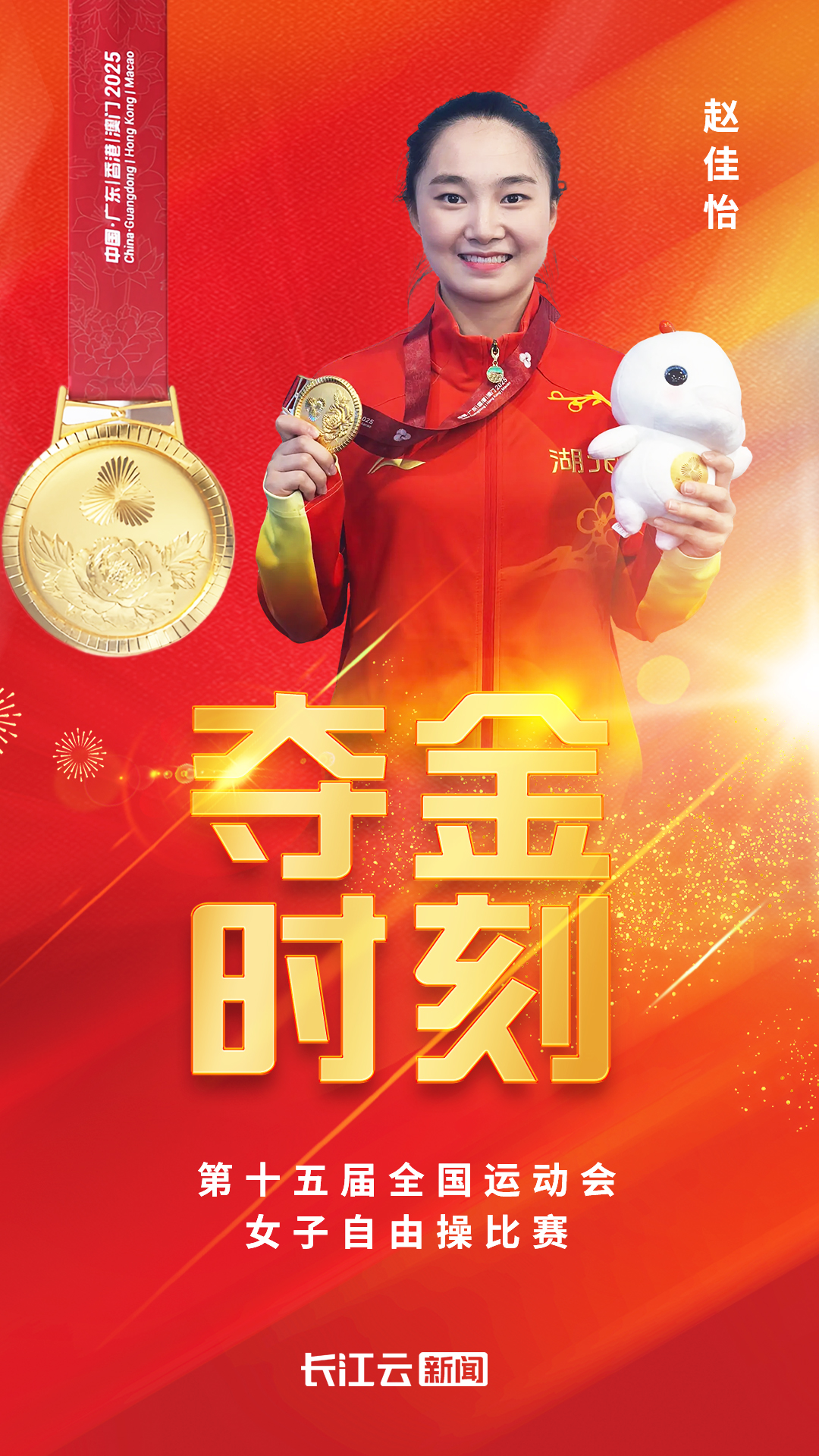 11月17日晚,第十五届全运会女子自由操决赛燃情上演。湖北队选手赵佳怡凭借流畅的动作衔接与稳定发挥,在一众强手中脱颖而出,勇夺金牌,为湖北代表团再添荣耀,这也是湖北队本届全运会的第17枚金牌。