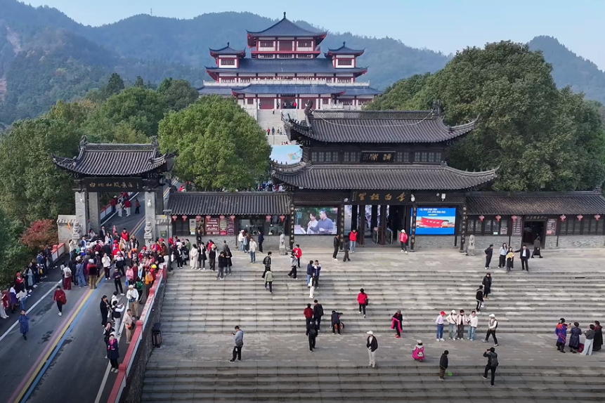 连日来的白兆山,处处游人如织、热闹非凡。不少游客或是携家带口,或是约上三五好友,沿着青石板路缓步登高,在层峦叠翠间寻访诗仙笔下的山水雅韵。景区里,聆听讲解、打卡留影的游客络绎不绝,漫山翠色与古色古香的亭台楼阁相映成趣,勾勒出一幅流动的山水人文画卷。