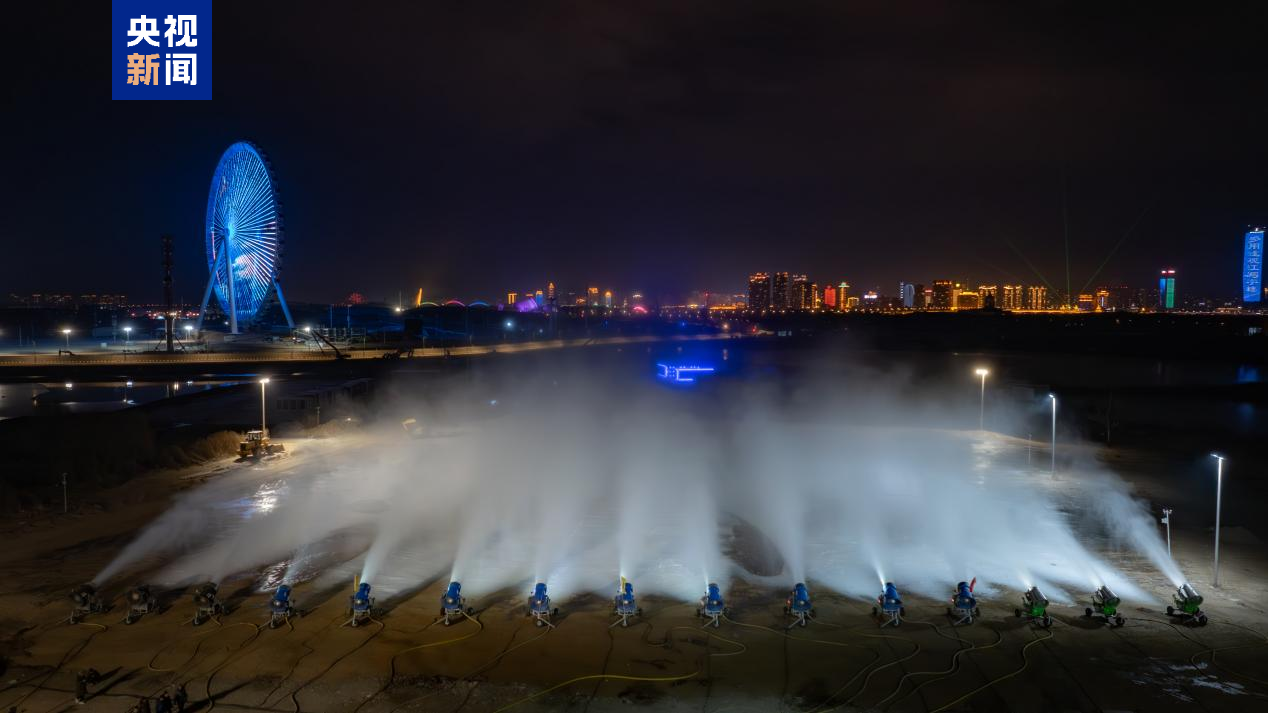 11月17日晚,哈尔滨冰雪大世界造雪工作启动,多台造雪机同时开启、测试运转,随着技术人员对设备参数、造雪角度等的调整,皑皑白雪成功从造雪机中不断飘出。