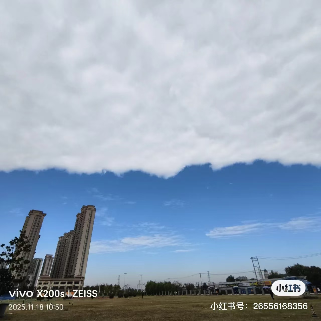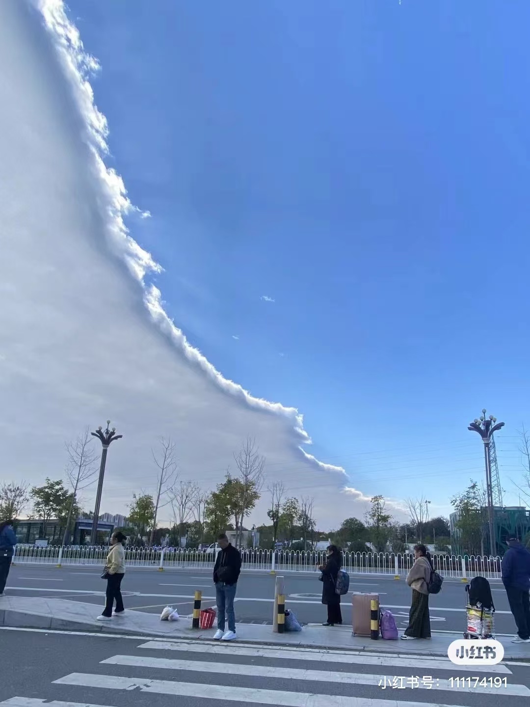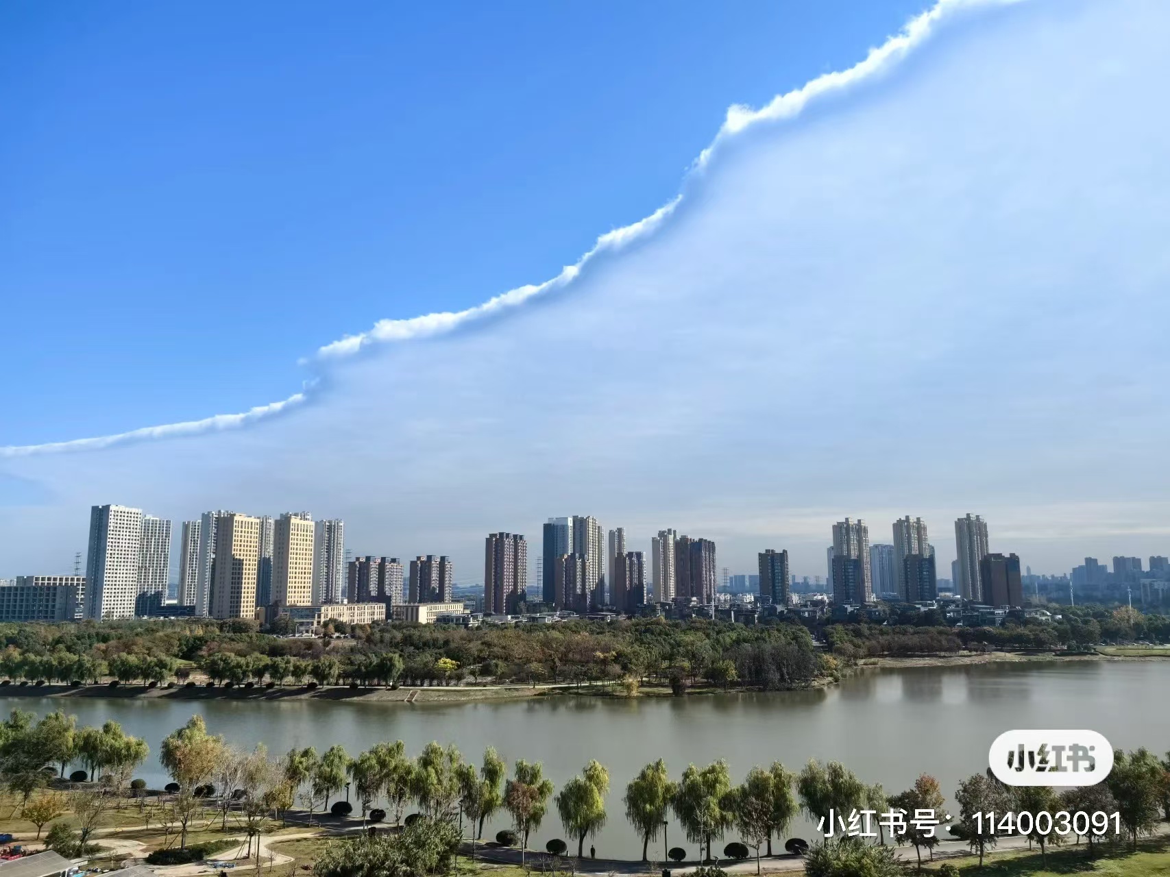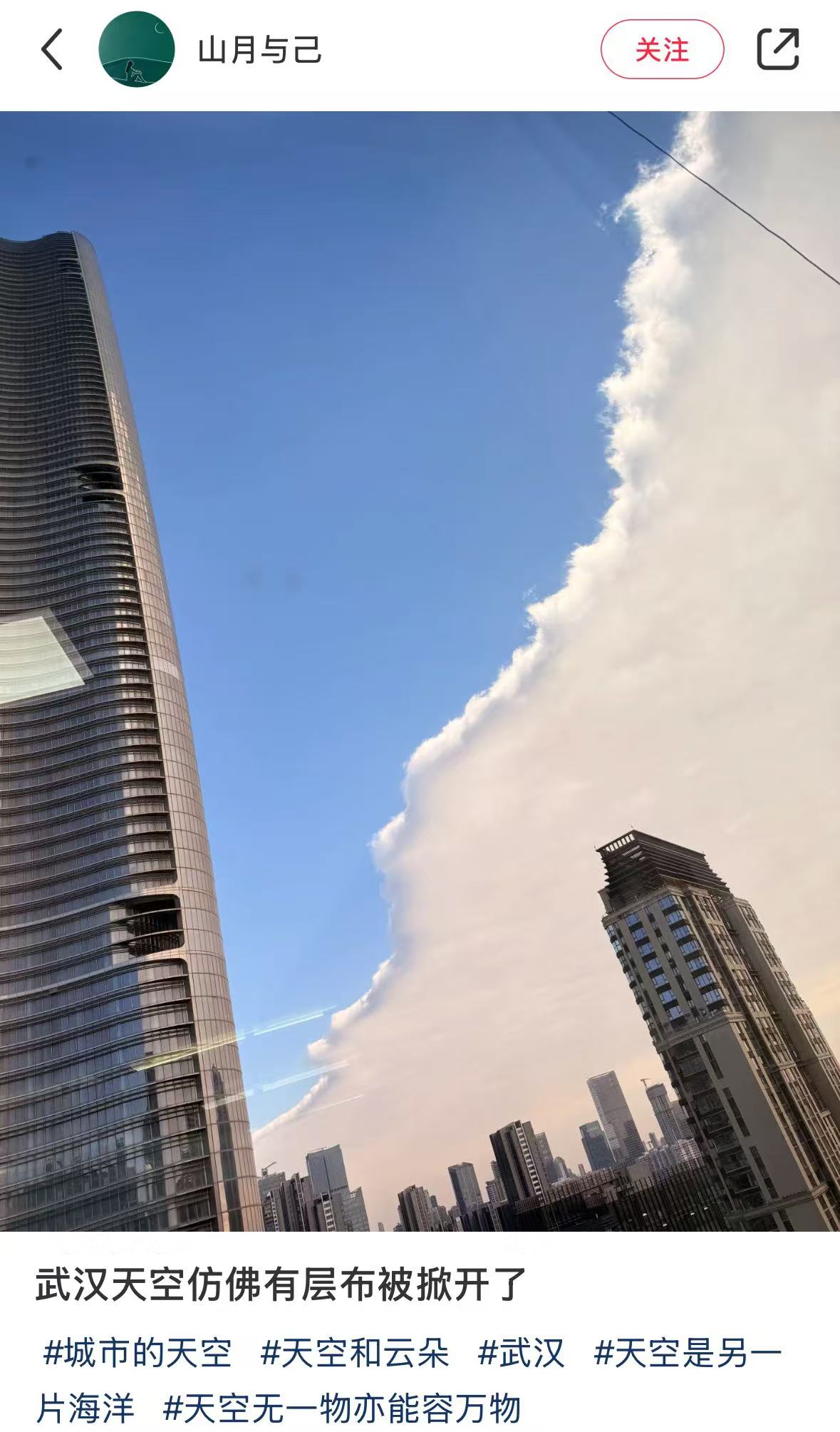 为何会出现这般罕见美景?@湖北天气 科普称,这种泾渭分明的云层分界线出现时,往往意味着有干冷天气系统在移动,和暖湿云层相互挤压,挤压力就会导致蓝天白云出现了整齐的界限,从而看起来泾渭分明。 简单来说,就是冷暖空气在“掰腕子”,预示着天气可能会有变化。