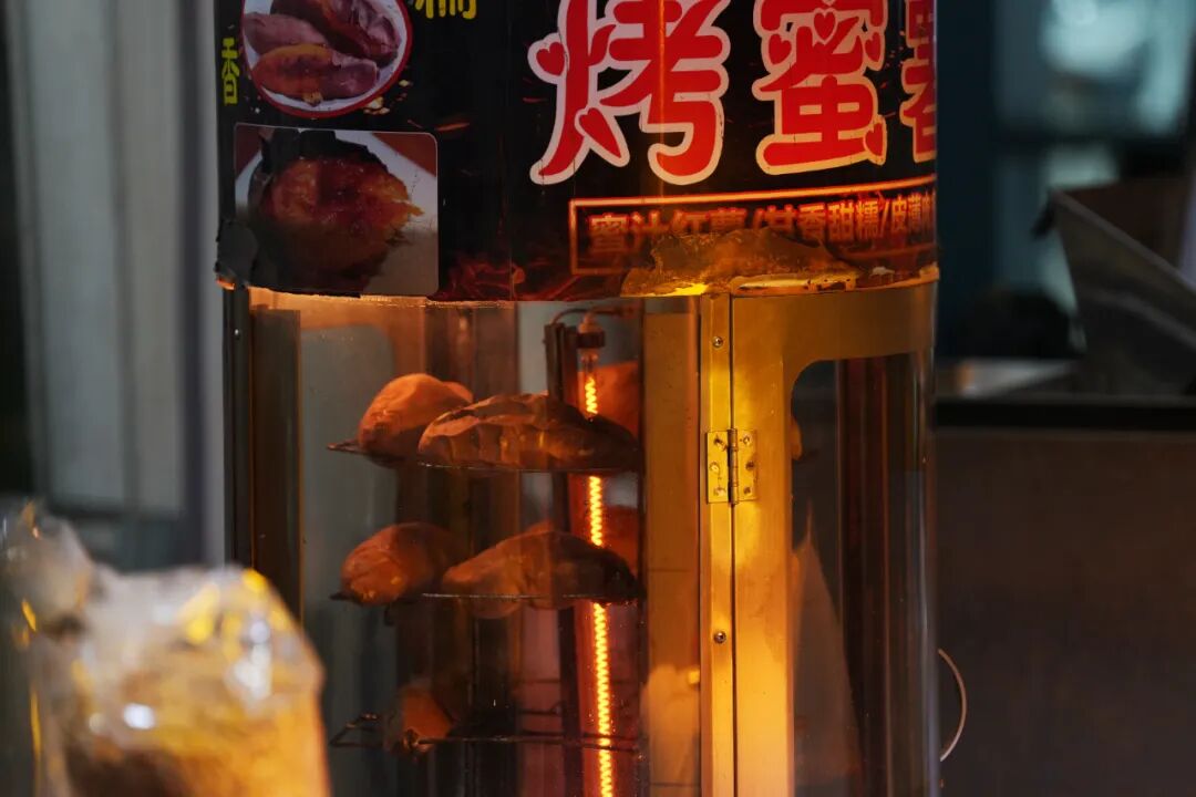 烤红薯摊热气氤氲升腾