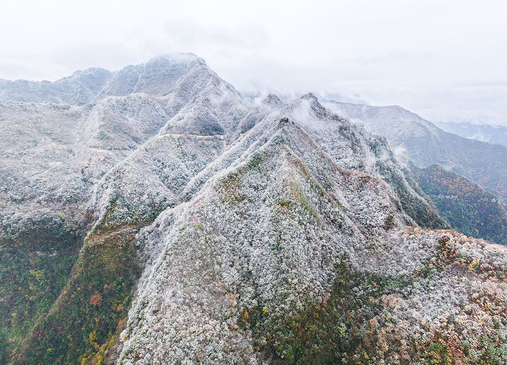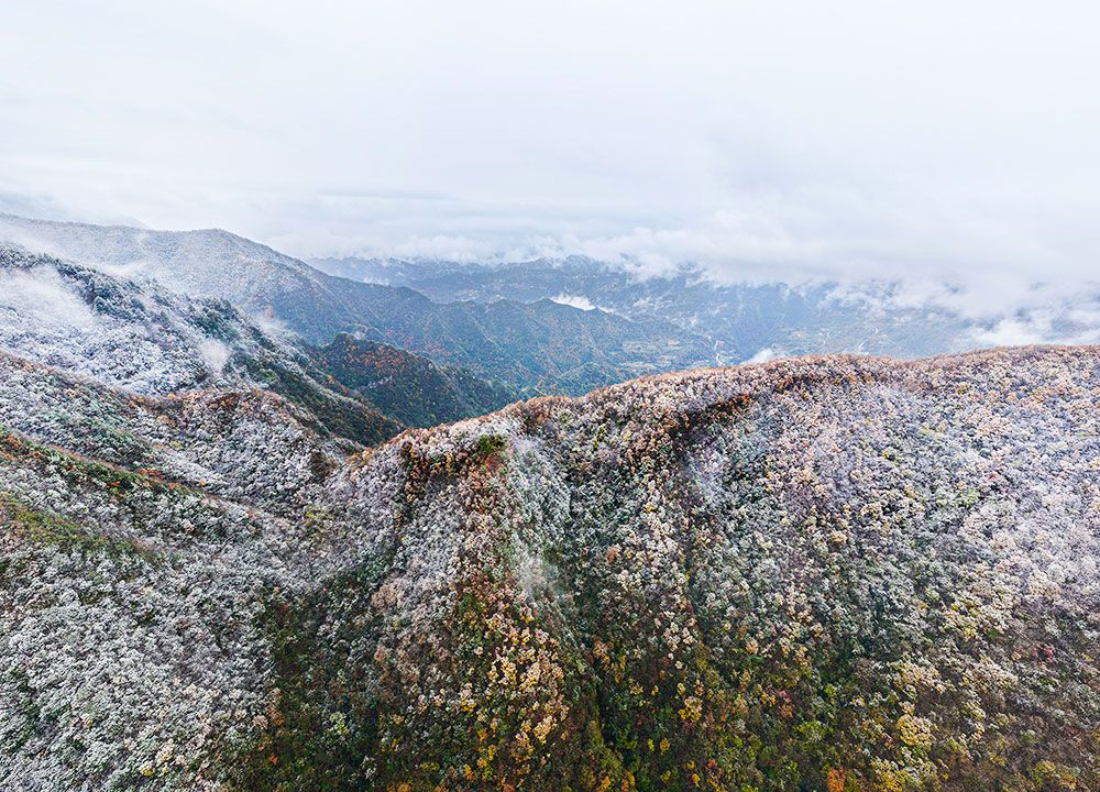 11月17日,湖北恩施巴东县高海拔地区绿葱坡和野三关迎来今冬首场降雪。纷纷扬扬的雪花从天而降,与秋色共舞在山巅,绘就一幅秋冬季节交织的绝美画卷。