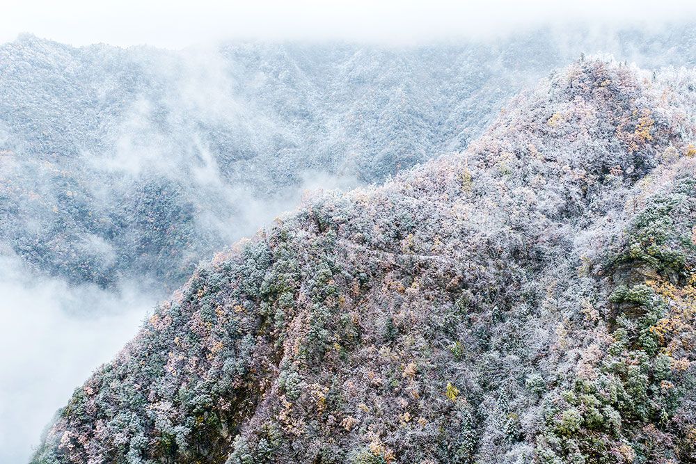 霜雪轻覆山野,秋色未褪的林木在云雾中若隐若现,宛如水墨丹青。