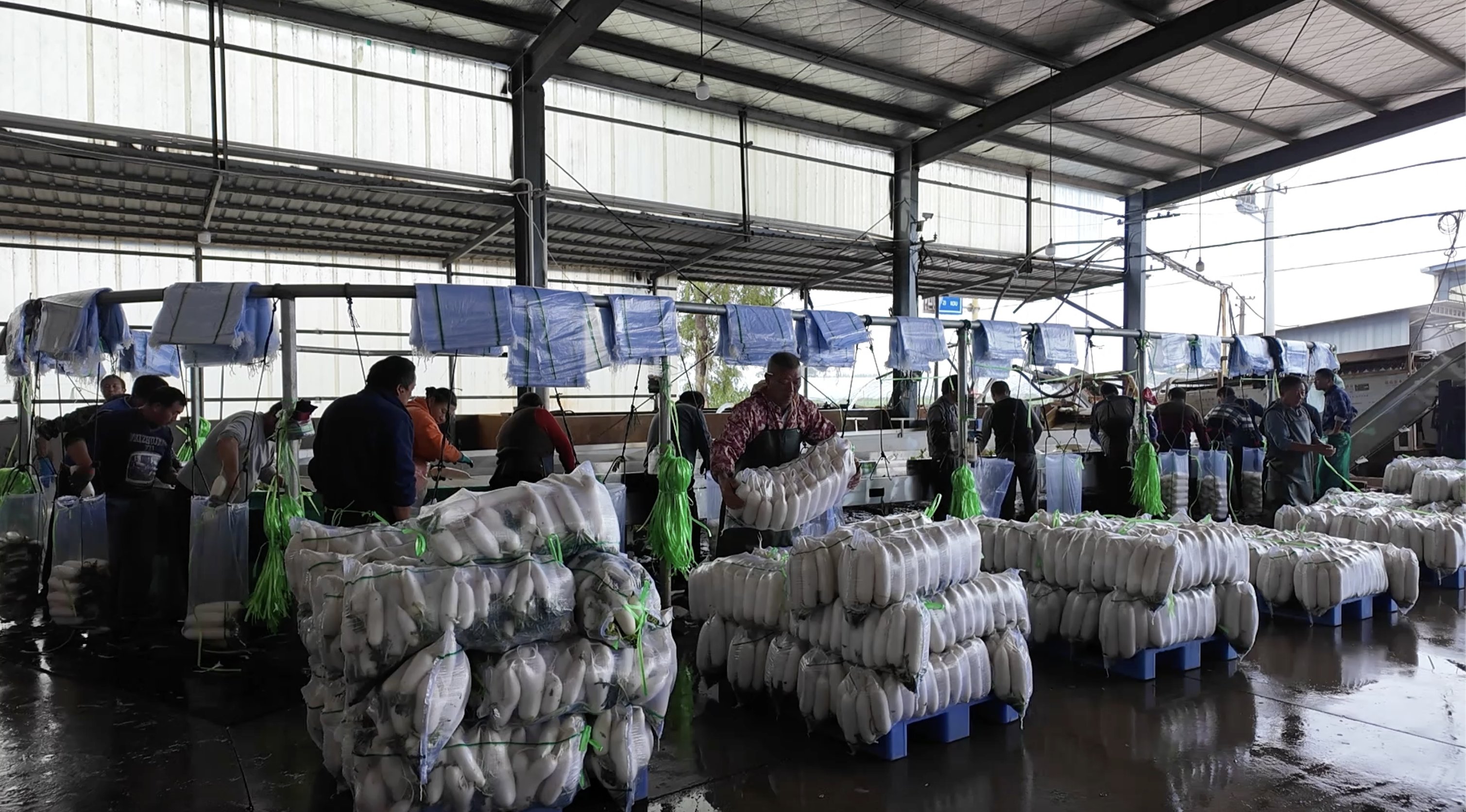 在马羊洲村的森林蔬菜专业合作社,工人们正忙碌地进行萝卜清洗、分拣和打包。机械化清洗后的萝卜经传送带输送而出,随即送入冷库存储,为发往全国各地做好准备。
