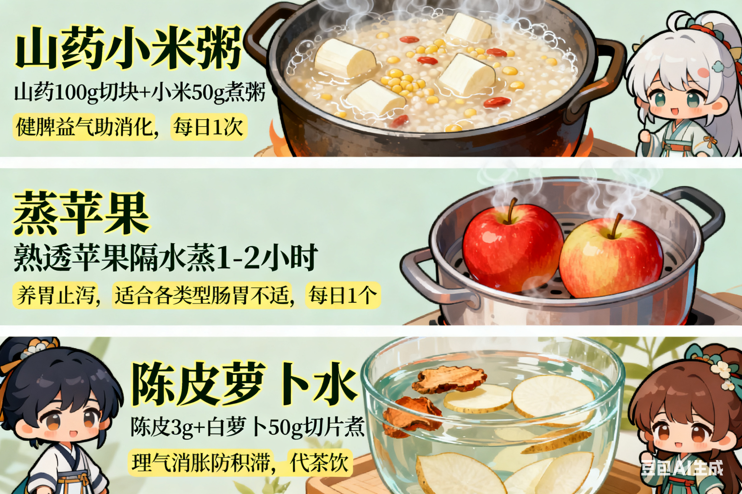 山药小米粥:山药100g切块+小米50g,煮粥温服,每日1次,健脾益气助消化。