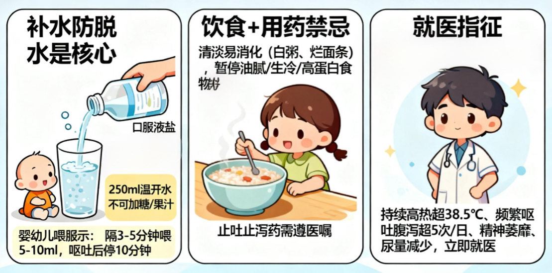 发病期间吃白粥、烂面条等清淡易消化食物,暂停油腻、生冷、高蛋白食物。专家提醒,“孩子出现呕吐等症状时,应在医生指导下使用止吐或止泻药物”,切勿自行用药加重肠胃负担。
