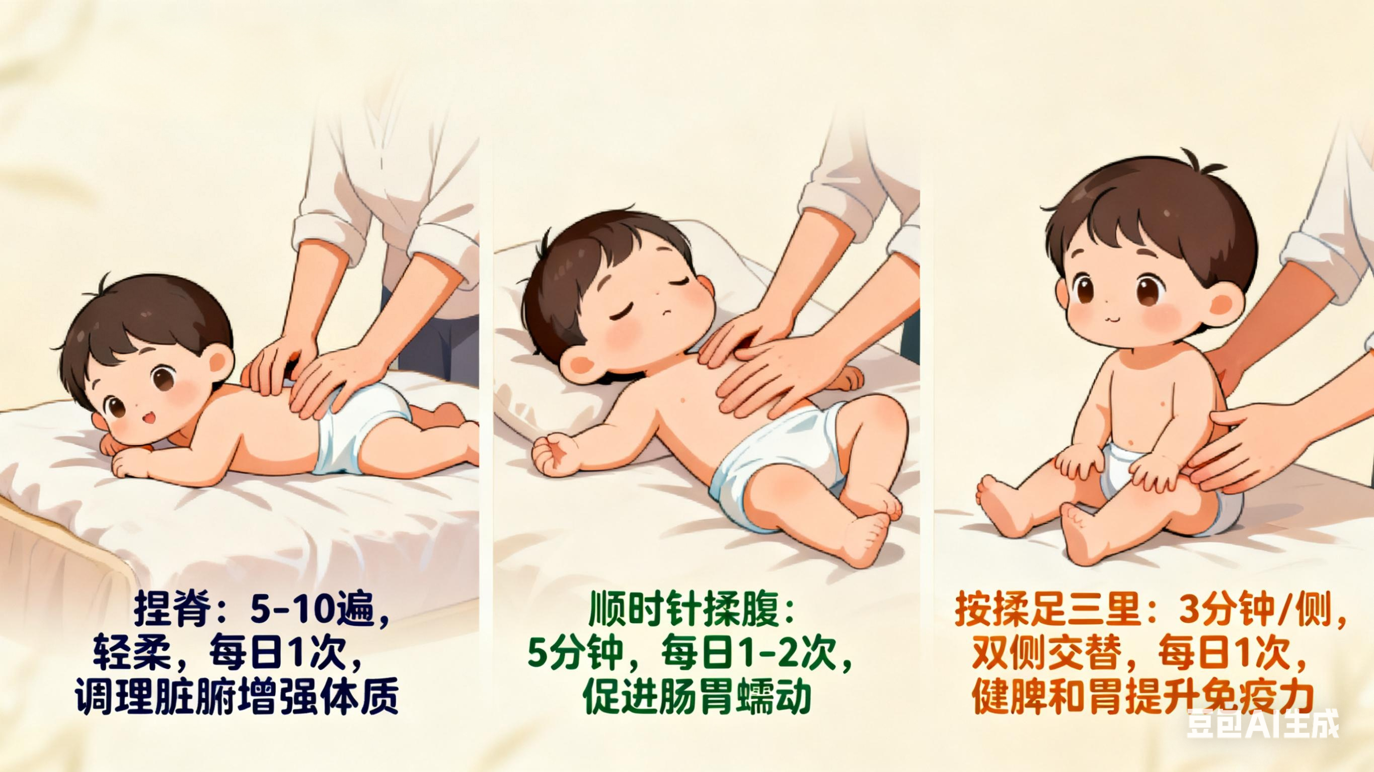 捏脊:宝宝俯卧,从尾椎骨沿脊柱两侧向上捏至大椎穴,每次5-10遍,力度轻柔,每日1次,调理脏腑增强体质。