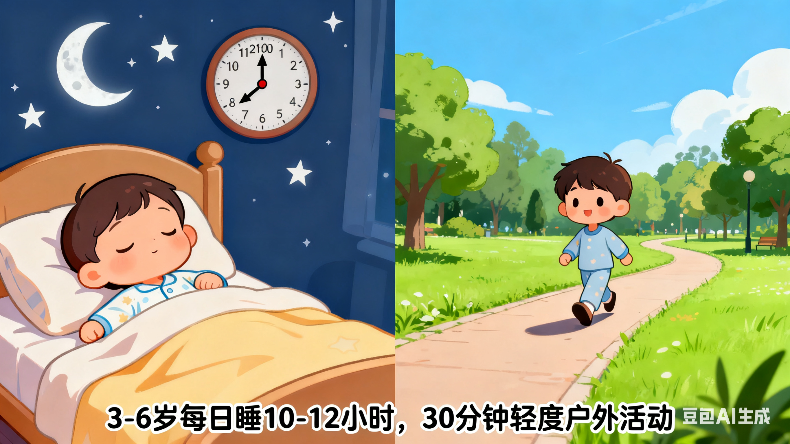 3-6 岁宝宝每日睡眠10-12小时,9点前入睡促进免疫细胞修复;天气晴朗时,进行30分钟轻度户外活动(散步、慢跑),增强心肺功能和机体抵抗力。