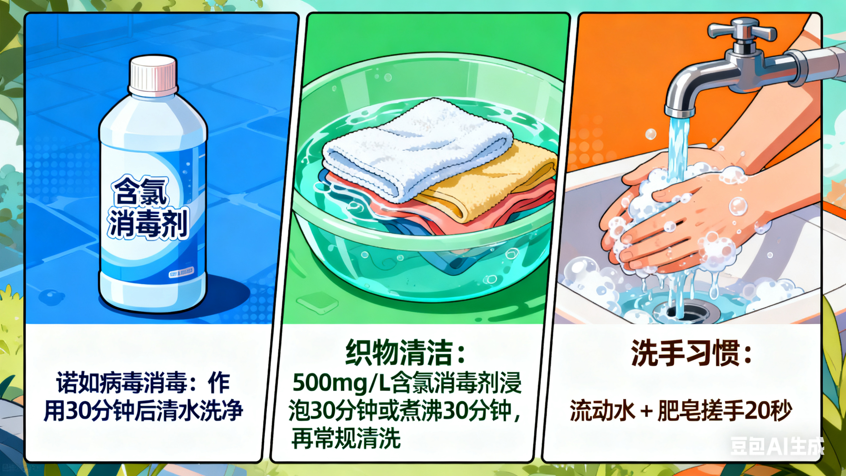 1、中国疾控中心明确,诺如病毒消毒需用含氯消毒剂,无肉眼可见污染物时用1000mg/L 浓度喷洒或擦拭,作用30分钟后用清水洗净;