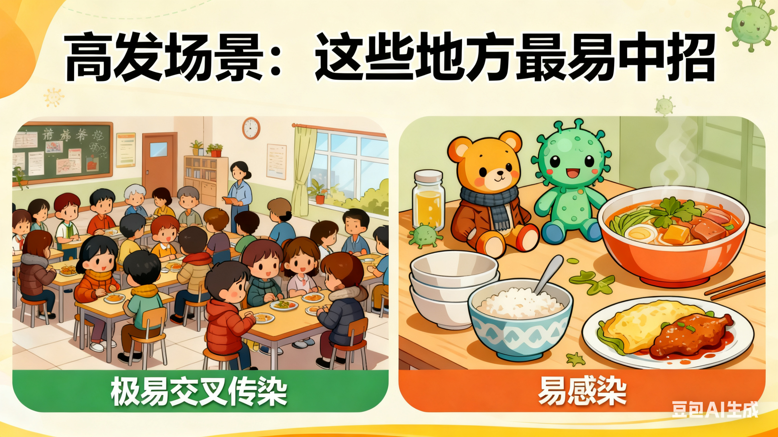 诺如病毒:主要通过粪-口途径传播,接触被污染的食物、水、物品,或吸入呕吐物形成的气溶胶都可能感染。学校、托幼机构、养老院等集体场所人员密集,一旦出现病例,极易交叉传染。