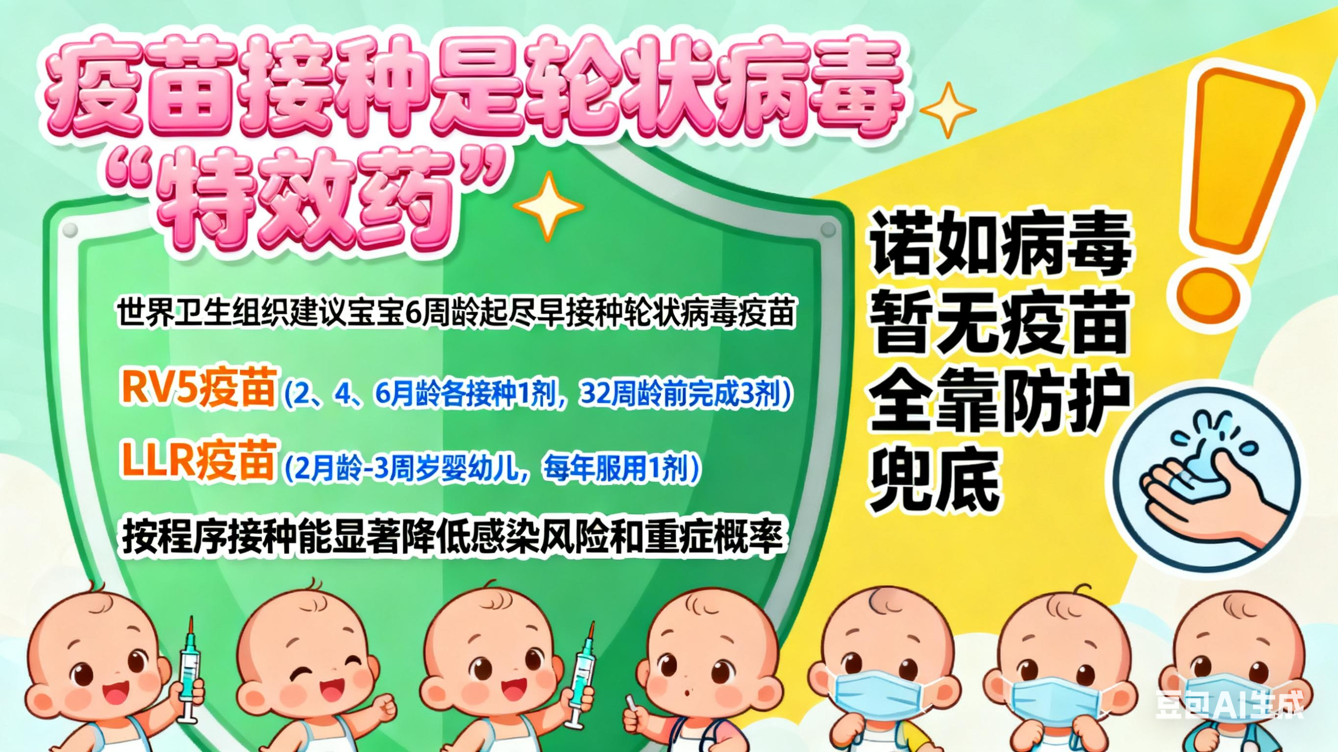 世界卫生组织明确建议,宝宝6周龄起尽早接种轮状病毒疫苗。我国目前使用的轮状病毒疫苗为口服减毒活疫苗,分为RV5疫苗(2、4、6月龄各接种1剂,32周龄前完成3剂)和 LLR 疫苗(2 月龄-3周岁婴幼儿,每年服用1剂),按程序接种能显著降低感染风险和重症概率。诺如病毒暂无疫苗,全靠防护兜底。