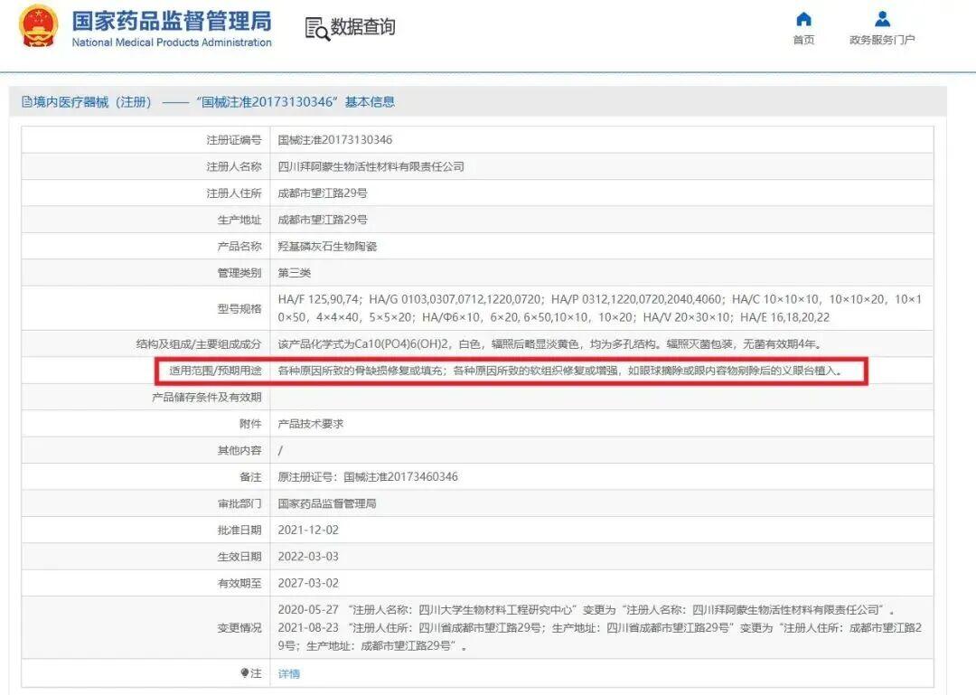 国家药品监督管理局网站显示,菲林普利又叫羟基磷灰石生物陶瓷,适用范围为:各种原因所致的骨缺损修复或者填充,各种原因所致的软组织修复或增强,如眼球摘除或眼内容物剜除后的义眼台植入,但适应症中并未注明适用于医美。