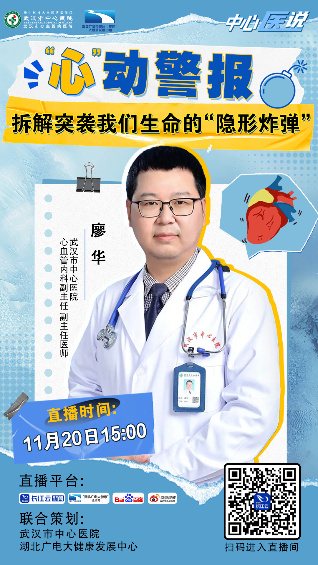 11月20日是中国心梗救治日,武汉市中心医院与湖北广播电视台联合推出科普直播《“心”动警报:拆解突袭我们生命的“隐形炸弹”》,特邀武汉市中心医院心内科副主任、副主任医师廖华,来帮我们解开最熟悉的“心”事。