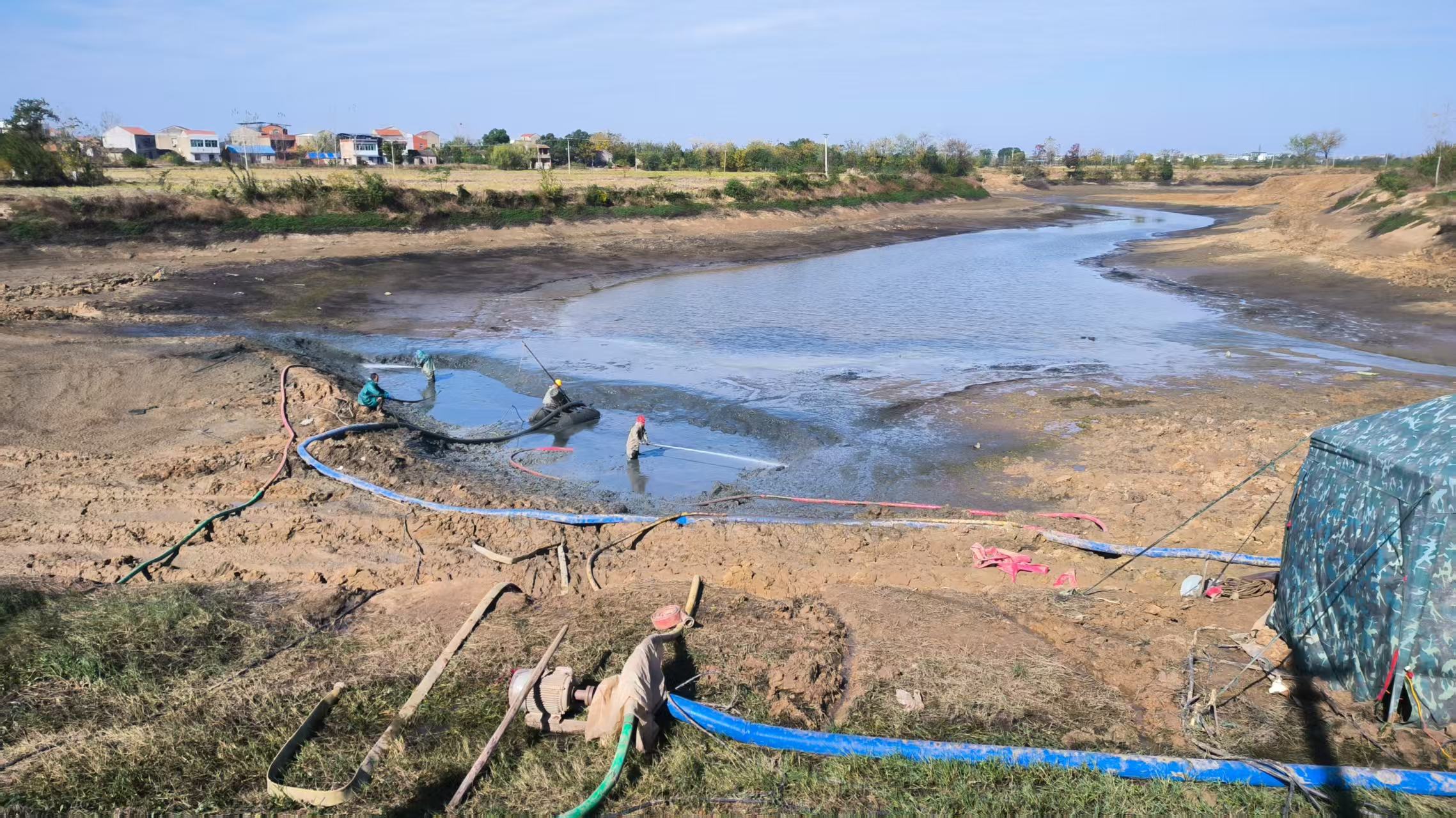 11月20日,在湖北孝感云梦县吴铺镇长辛村魏家大塘,机械轰鸣,5台挖掘机、7台推土机正在有条不紊地作业,施工负责人在工地上穿梭,指导开展塘堰扩挖、整形等工作;在曾店镇水庙水库,施工人员握着长长的泥浆泵,正在利用强劲的水力清理水库底部的淤泥,现场一片忙碌有序、热火朝天的景象……