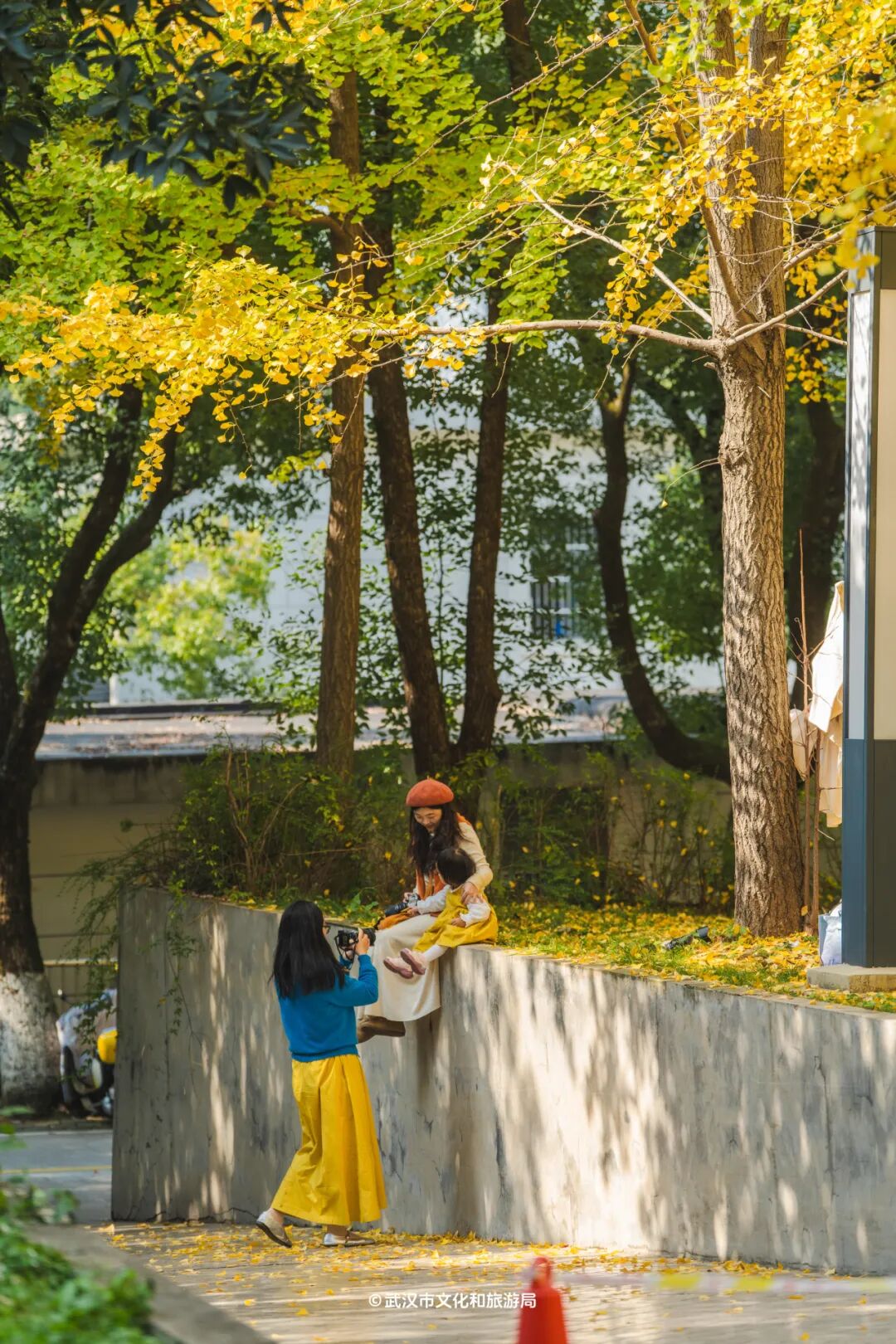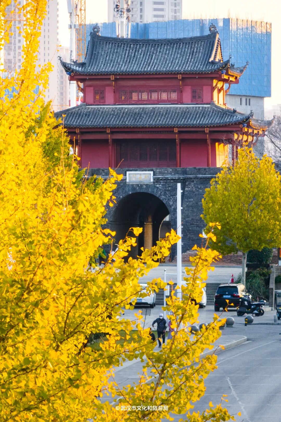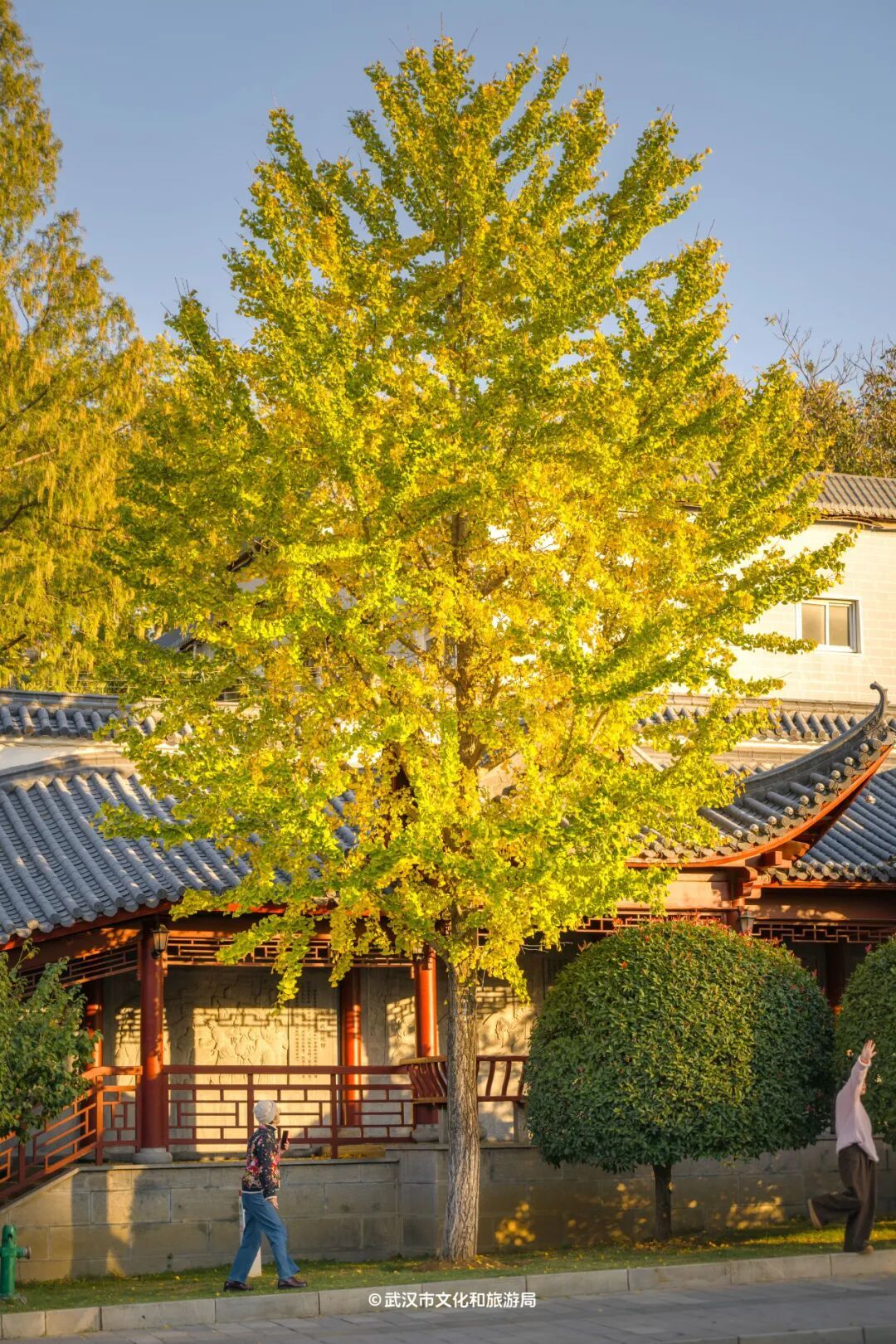 要是不想人挤人,起义门旁边的「风雨长廊」也有几棵金灿灿的银杏,伫立在古朴的长廊边,诗意不输城墙之上。
