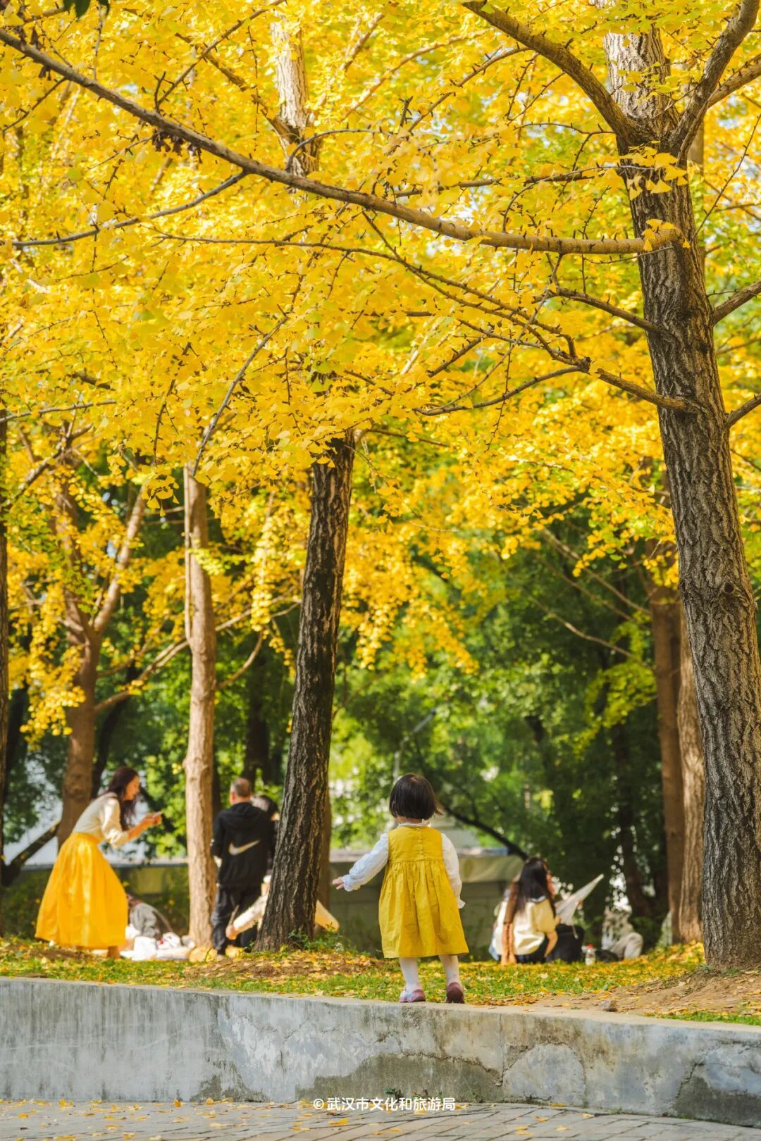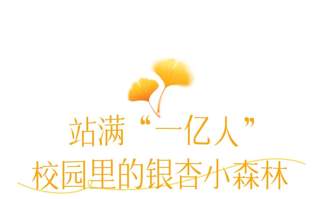 近100棵高大的银杏树扎堆,树形高大、种植得密集,自成一片金色小森林,很有气势。