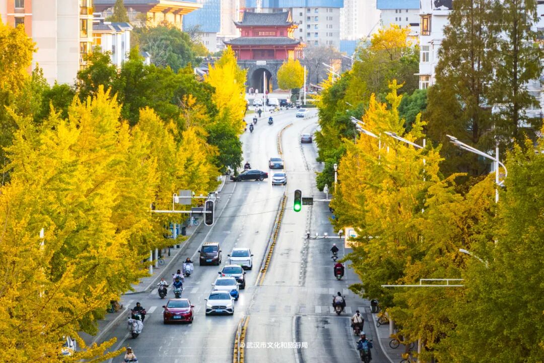沿着首义路走到尽头就是「起义门」,银杏、无患子、鸡爪槭层层叠叠,彩叶绵延上百米。