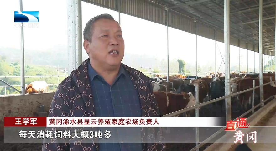 黄冈浠水县显云养殖家庭农场负责人 王学军:我们这个场地占地13000多个平方,我家有3个牛场,牛有400多头,羊有140多头,每天消耗饲料大概3吨多。