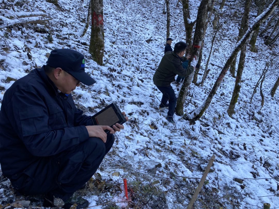 这支由4人组成的团队穿越茂密竹林,攀登坡度达70度的陡峭山峰,依托平板电脑导航,历经近2 小时抵达阴坡采样点。尽管风雪严寒,队员们迅速分工,3人用RTK定位仪、卷尺等设备测量树木胸径、做定位标记,1人通过平板终端实时录入数据、拍照上传,实现调查数据数字化留存与传输。