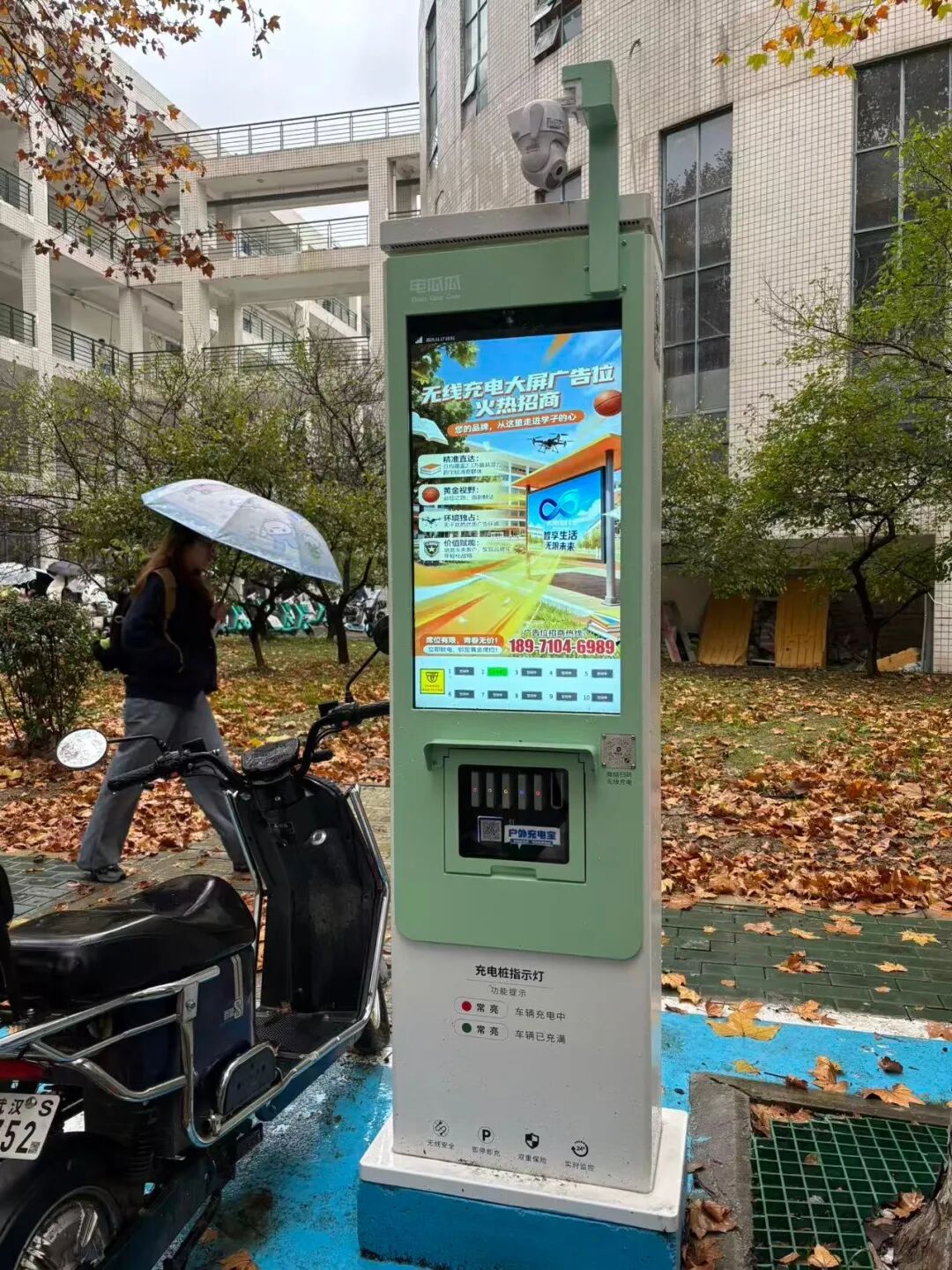 17日正值低温雨天,记者在现场看到,即使圆盘中有积水,电动车仍可正常充电。机柜屏幕上可显示10个充电位的使用情况,设备还附带共享充电宝功能并配有24小时监控系统。