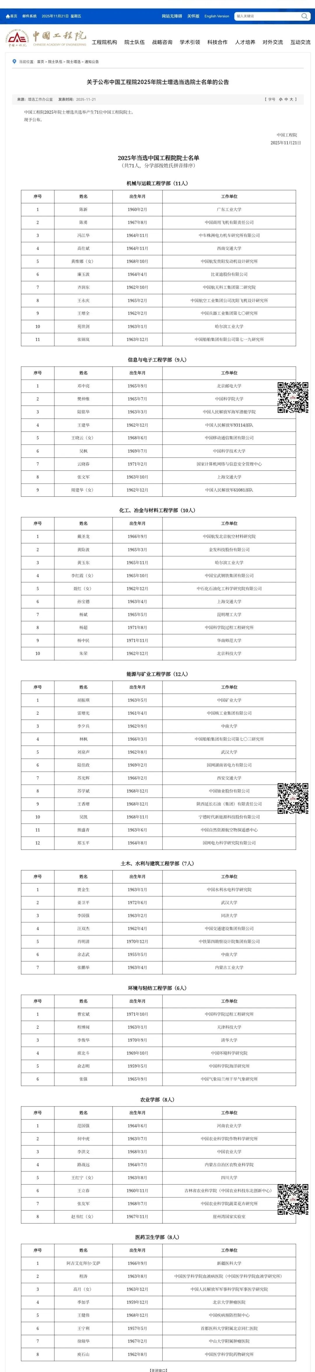 11月21日,2025年两院院士增选结果正式揭晓,共有144人当选。其中,共选举产生中国科学院院士73人,选举产生中国工程院院士71人。