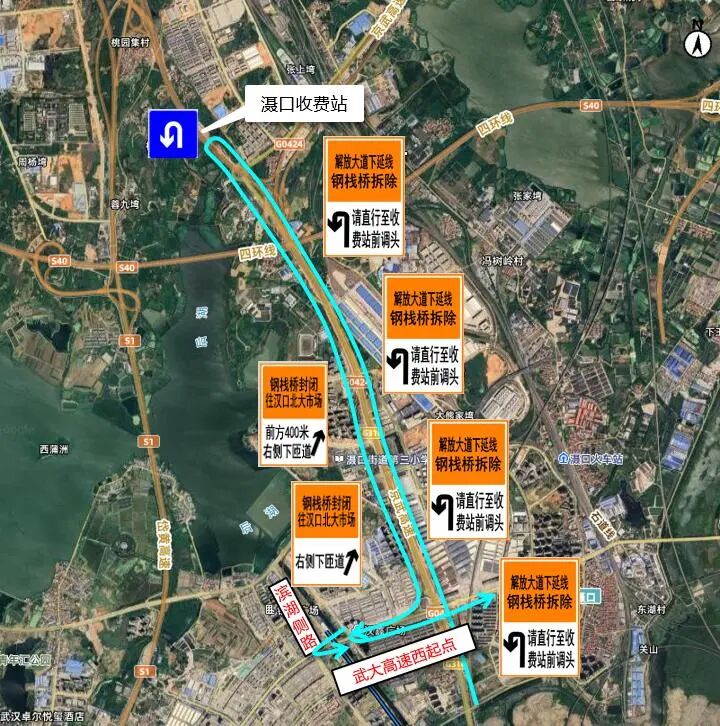 1.可继续沿武大高速前行至滠口收费站前调头,返回至汉口北互通E匝道下至汉口北大道,解放大道下延线→武大高速→滠口收费站调头→E匝道下至汉口北大道。