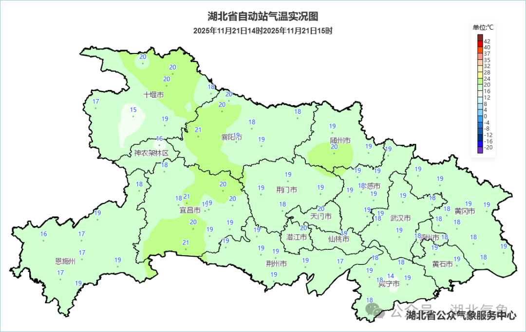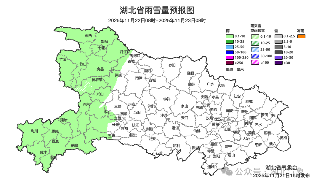 11月22日08时-23日08时,鄂西北、鄂西南多云转小雨,其中神农架高山地区有雨夹雪;其他地区多云。最高气温西部13~17℃、中东部17~20℃,最低气温3~8℃,偏北风2到3级。