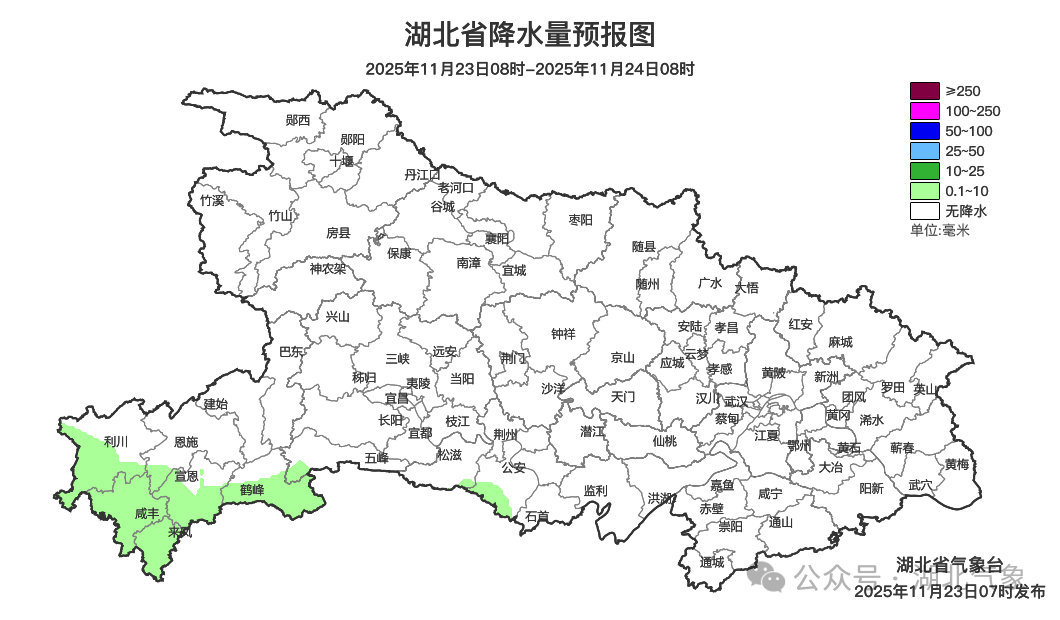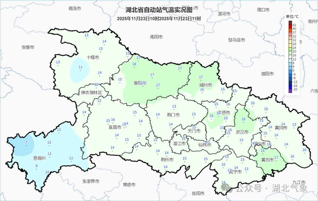 11月23日08时-24日08时,湖北全省阴天到多云,其中鄂西南、江汉平原南部局地有零星小雨。最高气温恩施地区13~17℃、其他地区17~21℃,最低气温北部2~7℃、南部7~10℃,偏南风2到3级。