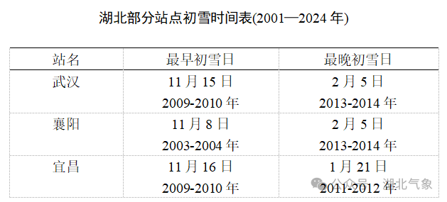 不过大部分年份,我省各地的初雪都下在12月份,以武汉市,从2001年起,武汉有9个年份的初雪下在了12月份,有6个年份初雪降在11月,分别是2009年11月15日,2011年11月30日,2015年11月24日,2016年11月23日,2020年11月24日,2022年11月30日。