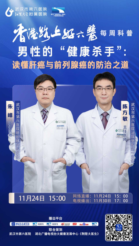 由武汉市第六医院与湖北广电大健康发展中心联合打造的“香港路上好六医”系列科普直播,特邀武汉市第六医院肝胆胰外科主任朱峰、泌尿外科主任陈方敏,帮男性朋友摸清防治逻辑,把健康主动权握在手中。