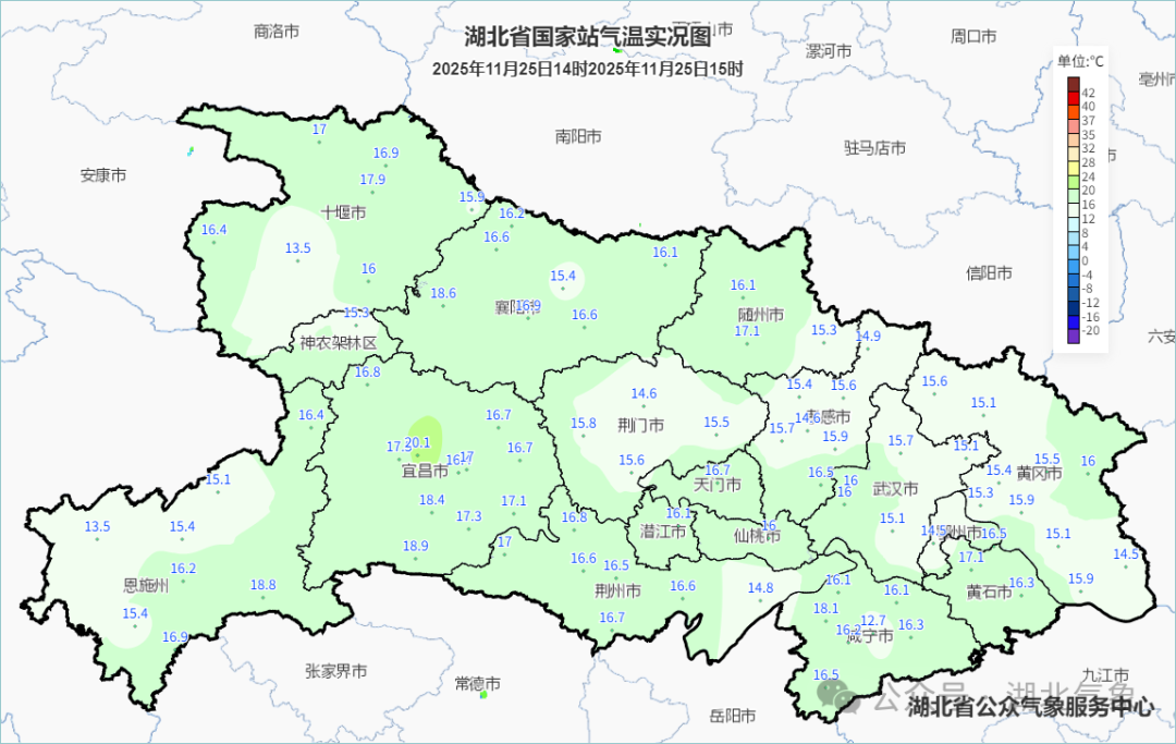 11月26日08时-27日08时,鄂西北多云到晴天,其中神农架高山区局地有雨夹雪;其他地区晴天到多云。最高气温16~20℃,最低气温北部-3~1℃、南部1~5℃,偏南风2到3级转偏北风3到4级、阵风5到7级,局地8级。