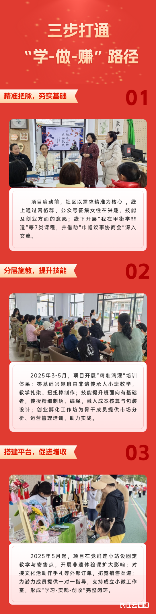 西陵区西坝街道甲街社区始终将服务女性发展、激发社区内生力量作为基层治理的重要支点。依托扎根社区多年的“王琼巾帼工作室”,社区精准对接资源,聚焦辖区全职宝妈、灵活就业及待业妇女对技能提升与灵活增收的需求,以非遗文化为特色,培育扶持了“屿妳结缘”女红坊项目。通过系统规划、分层培训和平台搭建,该项目有效提升了妇女的综合能力与收入水平,探索出了一条依托本土资源、赋能女性成长、弘扬传统文化的特色路径。