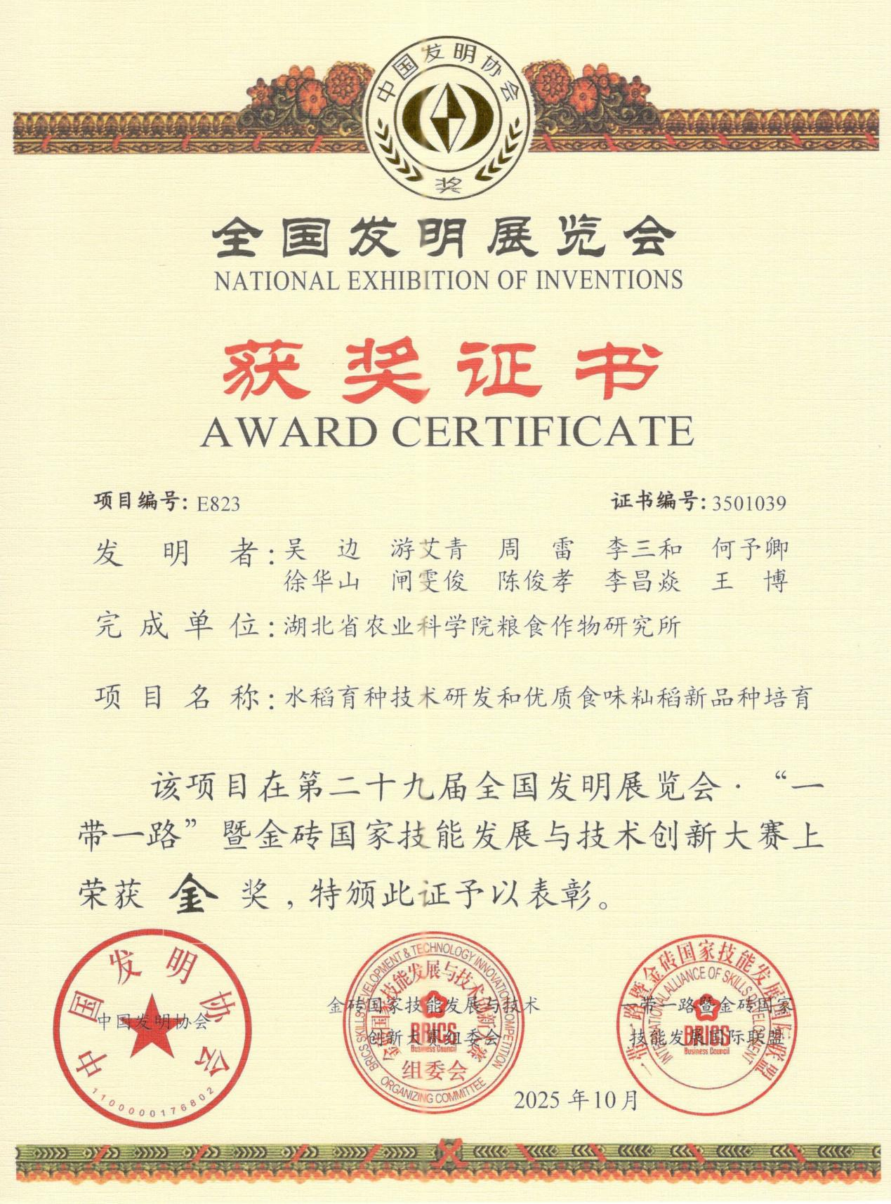 近日,中国发明协会对外发布“发明创业奖项目奖”名单,湖北省农科院凭借《水稻育种技术研发和优质食味籼稻新品种培育》项目斩获中国发明协会“发明创业奖项目奖”一等奖。据悉,该项目由院长、水稻学科首席游艾青研究员领衔的团队申报。这是该团队继上月摘得第二十九届全国发明展览会金奖后,斩获的又一重量级荣誉。