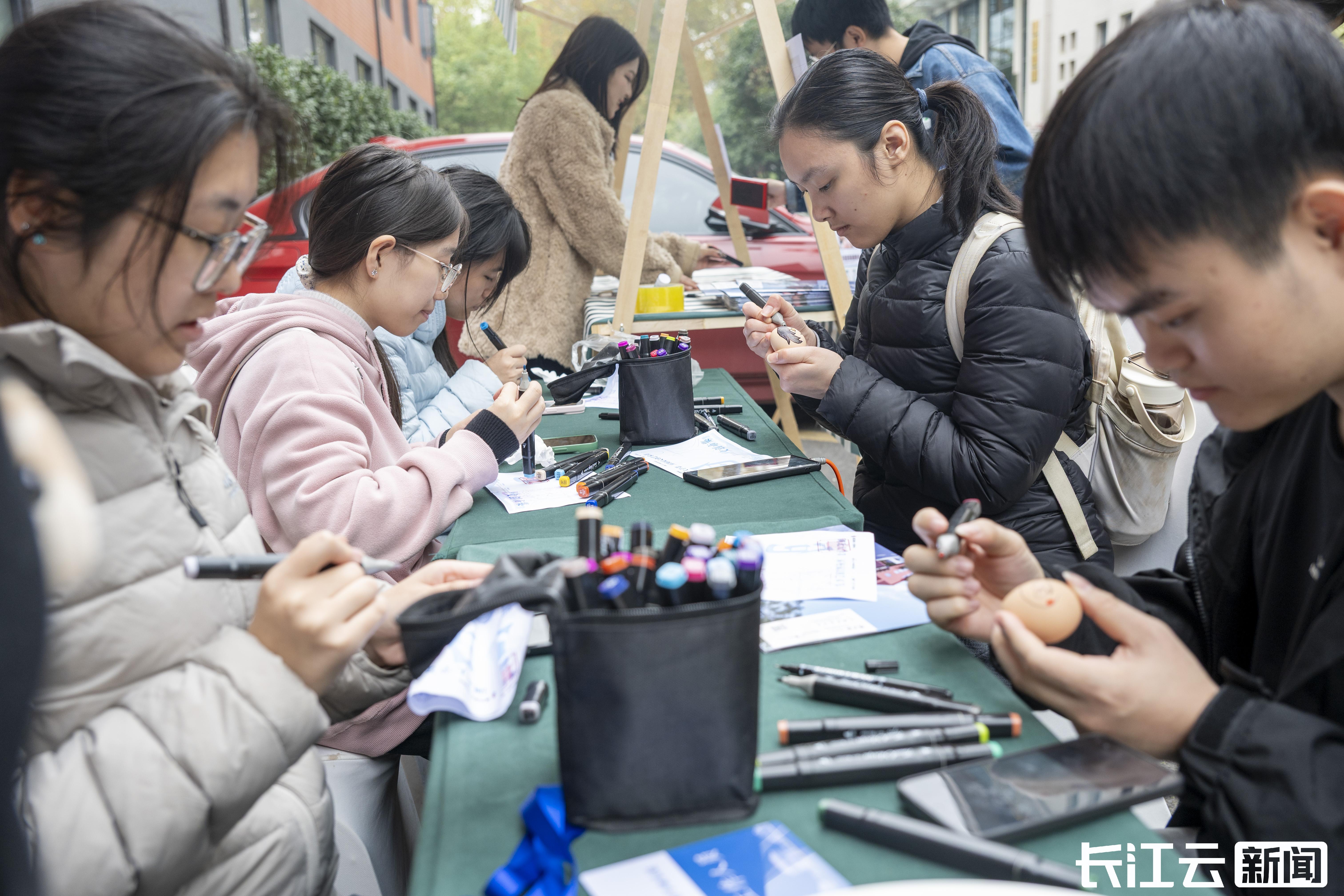 先用黑笔勾勒轮廓,再用彩笔上色,2024级美术学专业学生李加贝正在煮熟的鸡蛋壳面上绘制图案、尽情创作。11月24日,为期两天的湖北大学首届文创市集落下帷幕,吸引600余师生参与。