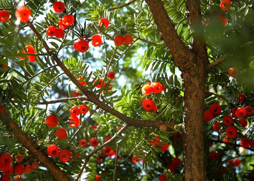 红豆杉的枝叶间缀满圆润鲜亮的红色浆果