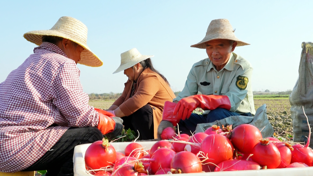 “今天要采收400斤,下午四点就得装车发货。我们这沙地里种的萝卜,又脆又甜,销路一直不愁。”村民饶华英一边麻利地清洗萝卜,一边介绍。刚出土的萝卜色泽鲜亮、水分饱满,凭借优良口感赢得市场青睐,订单从各地源源不断涌来,实现“采收即销售”的产销无缝衔接。