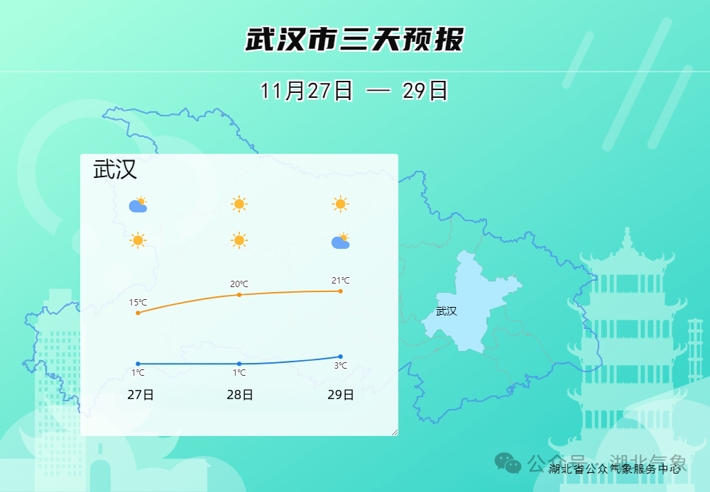 11月27日08时-28日08时,全省晴天间多云。最高气温15~20℃,最低气温北部-2~1℃、南部1~5℃,偏北风转偏南风2到3级。