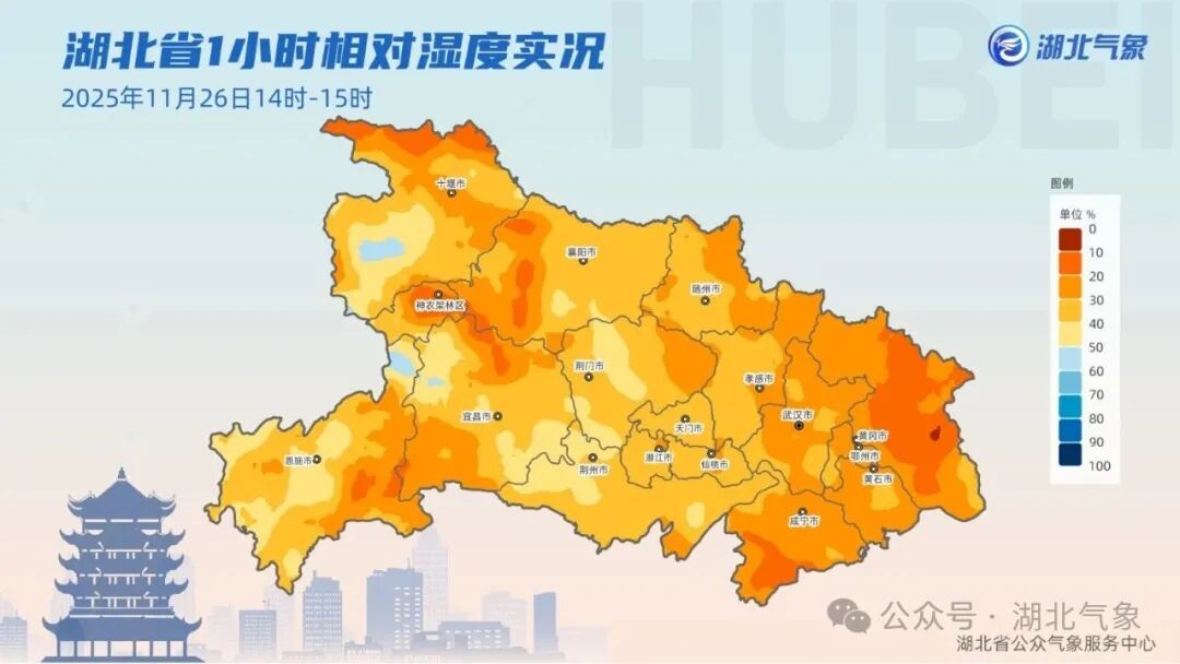 今天(26日),湖北延续晴朗干燥的天气格局,相比昨天气温小幅上升,空气湿度依旧很低。下午3点,全省最高气温17~20℃,同比昨天上升了2~4℃,大部地区最小空气湿度20%~30%,鄂东部分地区低于20%。