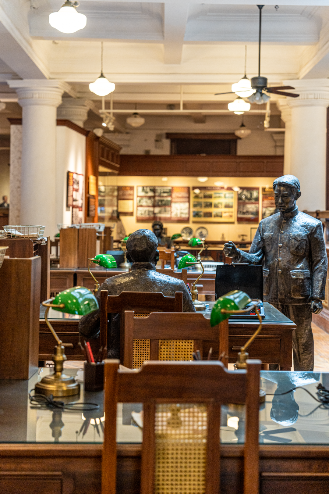 江汉关二楼原貌展示了当年的报关大厅。欧式家具、门窗,老式算盘、台灯、机械式计算机,与真人比例一致的铜雕人像和报关员,这些物品再现当年繁忙景象。