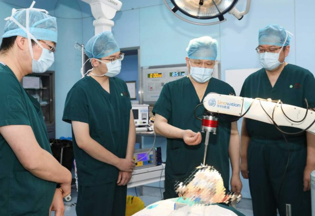 手术时,唐洲平教授(左三)和舒凯教授(右一)定位规划手术路径。