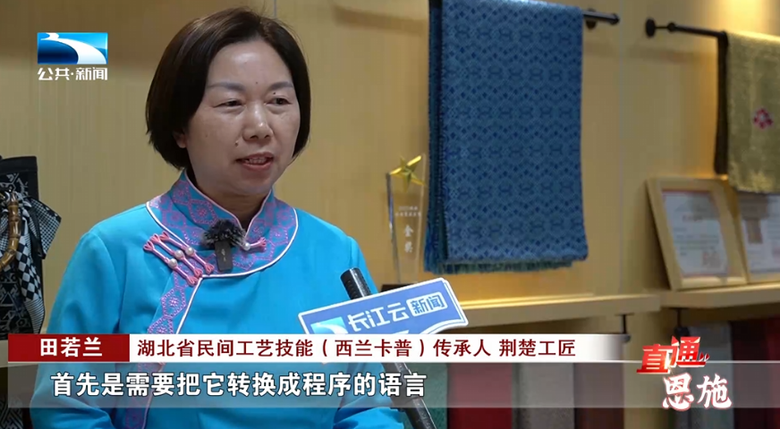 湖北省民间工艺技能(西兰卡普)传承人、荆楚工匠 田若兰:首先是需要把它转换成那个程序的语言,得给它写好哪一针、哪一根线需要提上来,哪一根线需要放下去,但是它跟手工的原理还是有很大差别的,所以刚开始完全搞不懂。