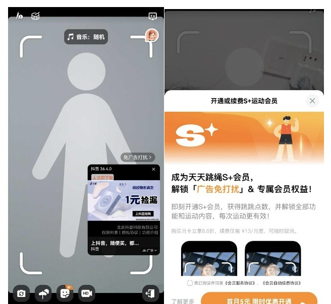 曾在小学生中风靡的天天跳绳,运动前要先看广告,点击跳绳后即出现短视频平台弹窗广告,如果想免打扰则需要开通会员。