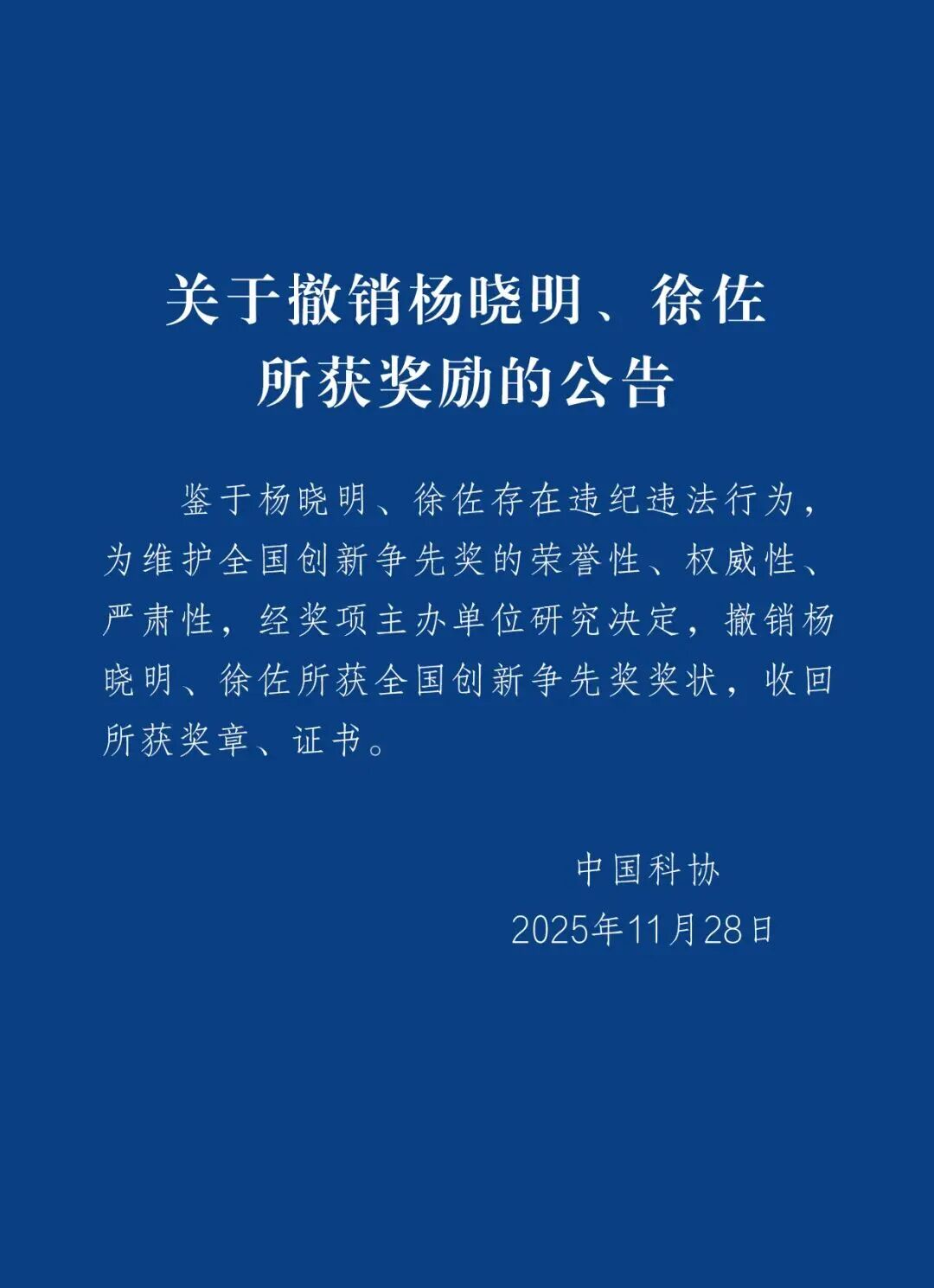 鉴于杨晓明、徐佐存在违纪违法行为,为维护全国创新争先奖的荣誉性、权威性、严肃性,经奖项主办单位研究决定,撤销杨晓明、徐佐所获全国创新争先奖奖状,收回所获奖章、证书。