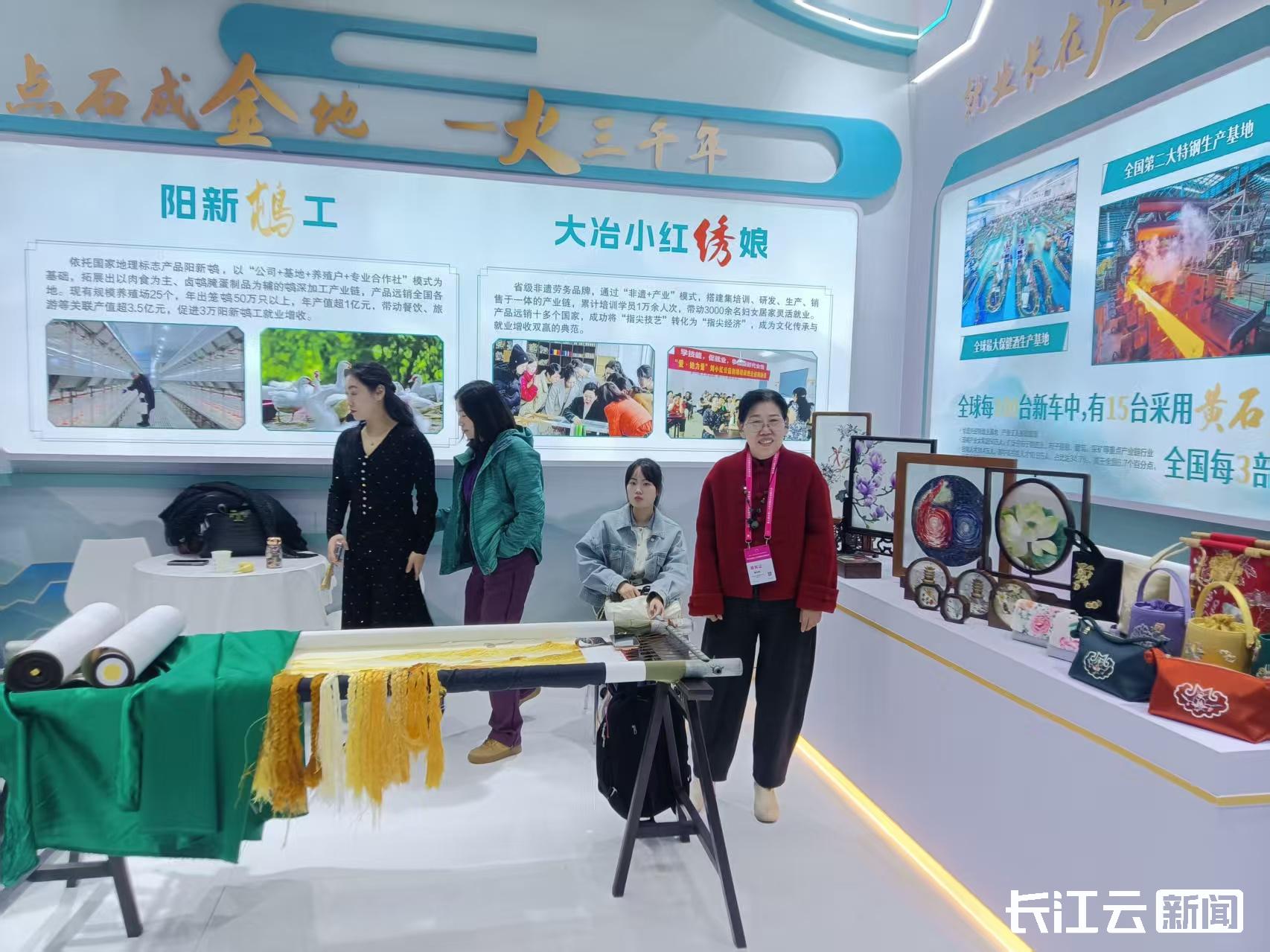 毗邻的“大冶小红绣娘”展区则以其精湛技艺引人驻足。绣娘们现场展示的“大冶刺绣”绣品,既传承了传统文化精髓,又融入了现代设计元素。该品牌特别注重带动留守妇女、贫困人员和残疾人等群体就业,累计培训绣娘万余人,促进更多妇女实现居家灵活就业,为乡村振兴贡献了独特的“巾帼力量”。