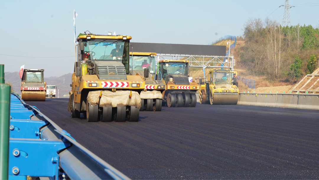 在京港澳高速湖北改扩建工程2标施工现场,多台摊铺机、压路机协同推进,沥青混合料被均匀铺设。
