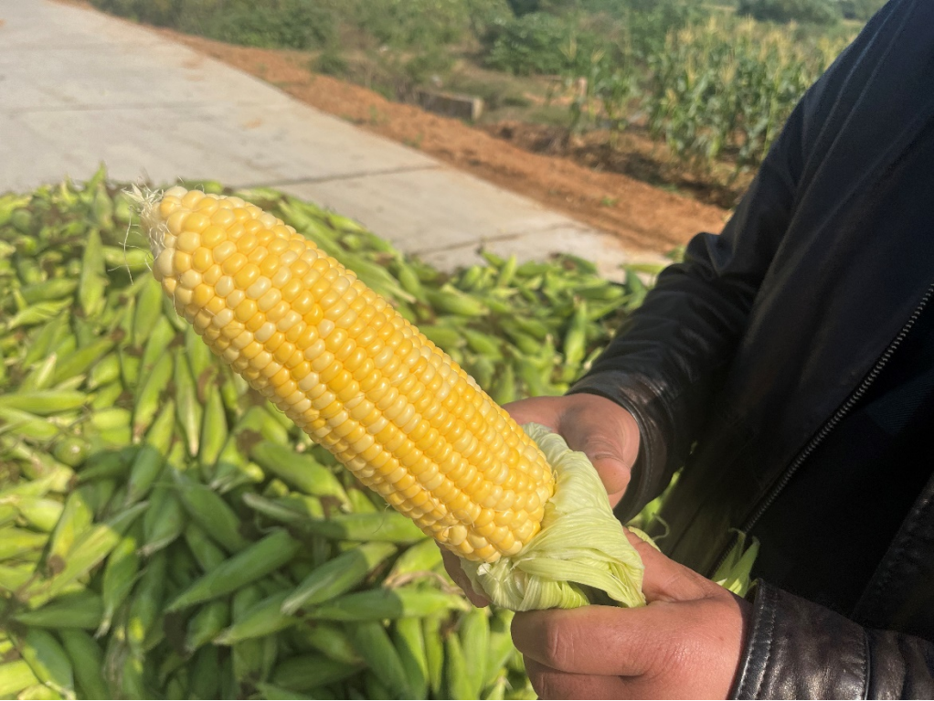 初冬的孝感市孝昌县邹岗镇的丘陵地上,一片金黄色的玉米在阳光下熠熠生辉,几台大型收割机正缓缓行驶,身后留下一排排整齐的秸秆。仰山村村民王晓云捧着刚采摘的甜玉米,笑着说:“这片荒地被老杨盘活了,今年玉米大丰收,大伙儿日子也跟玉米一样甜到心里。”
