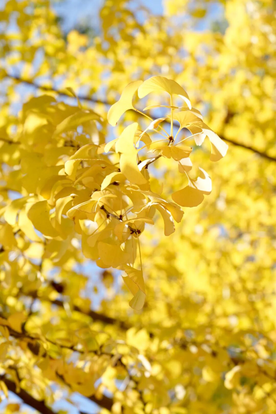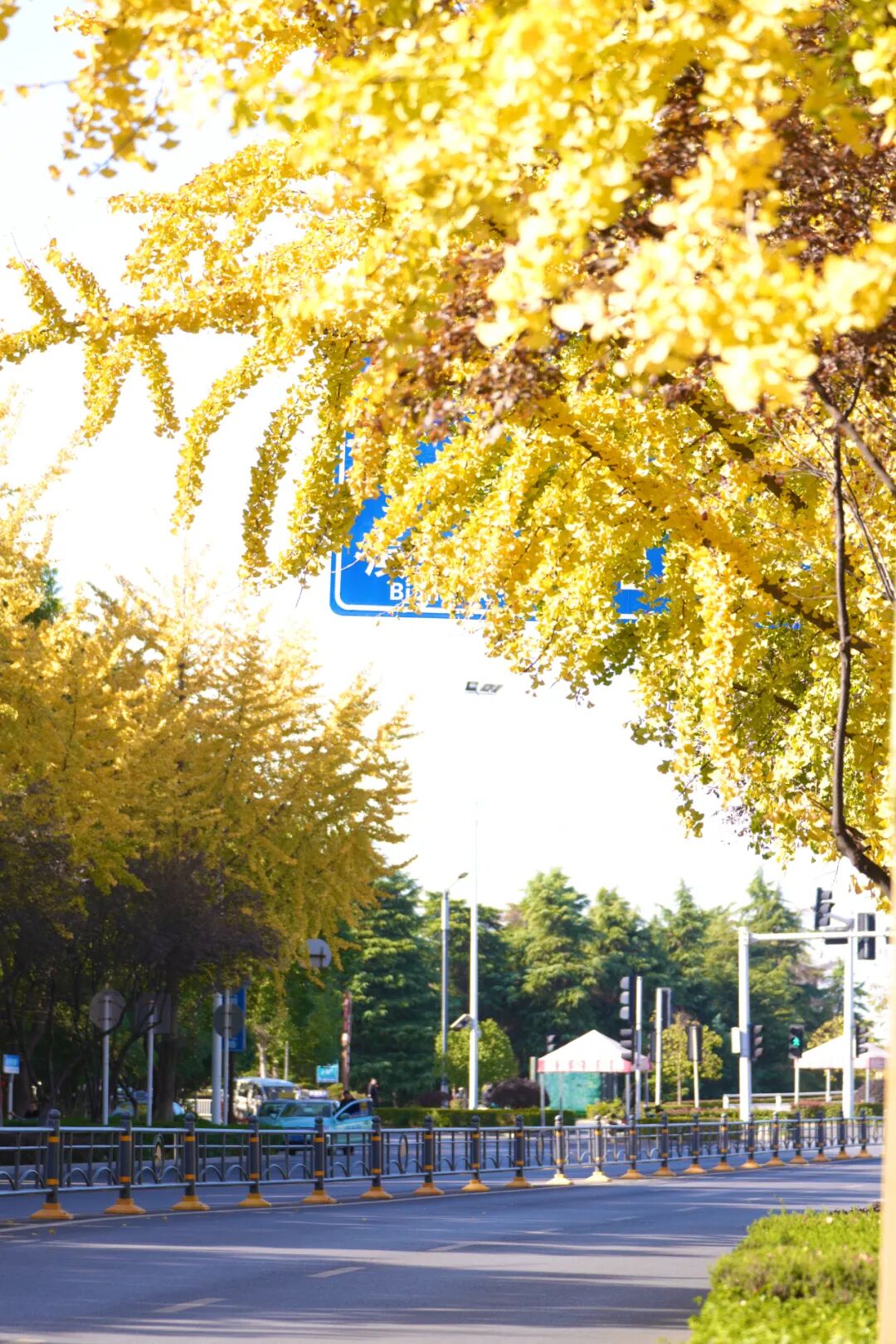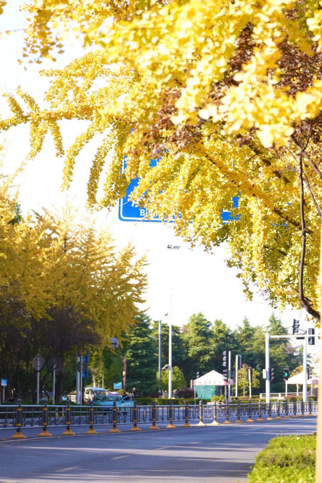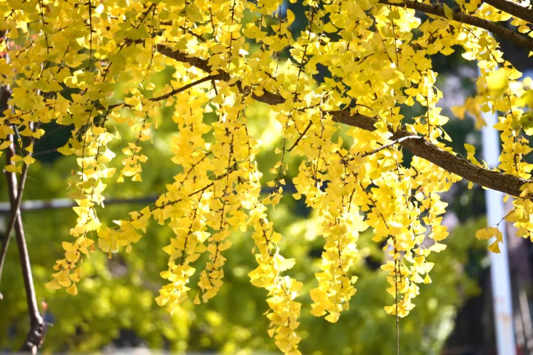 尽数倾泻在路两边高大的银杏树上