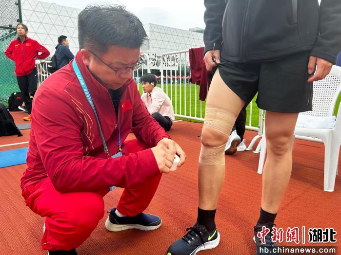 图为2025年全国田径大奖赛(第2站)陈建为苏玲丹做赛事康复保障。 武汉体育学院运动医学院供图