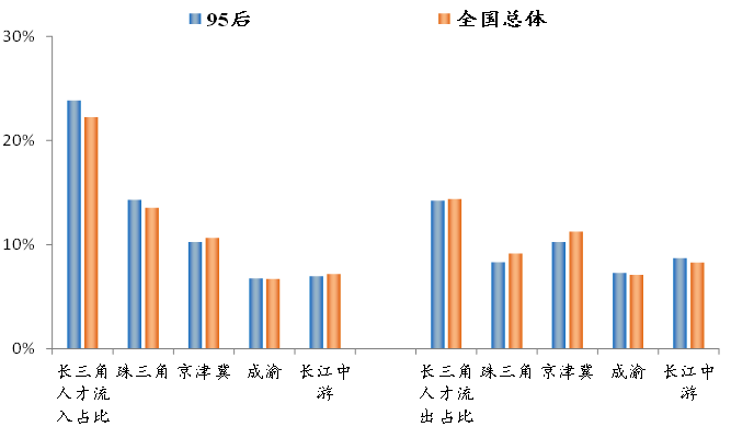 分城市群看,95后和全国总体流动人才净流入五大城市群占比为13.3%、10.1%,95后更倾向往五大城市群集聚。2025年8月国务院发布的《关于推动城市高质量发展的意见》提到:支持京津冀、长三角、粤港澳大湾区城市群打造世界级城市群,推动成渝地区双城经济圈、长江中游城市群等成为高质量发展增长极。这五大城市群以11%的土地聚集42%人口,创造53%的GDP,独角兽企业占全国的95%,其中长三角、珠三角城市群是经济最活跃地区,经济占比合计达29%,95后年轻人更倾向有经济活力的地区。