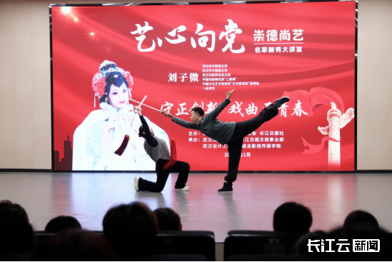 除了精彩纷呈的汇演,11月23日在成龙影视传媒学院举办的戏曲名家讲坛《守正创新 戏曲正青春》,为戏迷与学生代表带来了一场深度的文化盛宴。武汉戏剧家协会主席、中国戏剧梅花奖“二度梅”获得者刘子微结合自身从艺经历,解读京剧艺术的审美内涵与传承密码,分享经典剧目背后的文化故事,同时还带领青年演员现场示范唱腔技巧与表演程式,让同学们近距离感受京剧艺术的魅力。此次讲坛搭建了“名家与爱好者”的沟通桥梁,既传播了专业的戏曲知识,又激发了年轻一代对传统艺术的探索热情,助力京剧艺术在学术与实践层面的深度发展。
